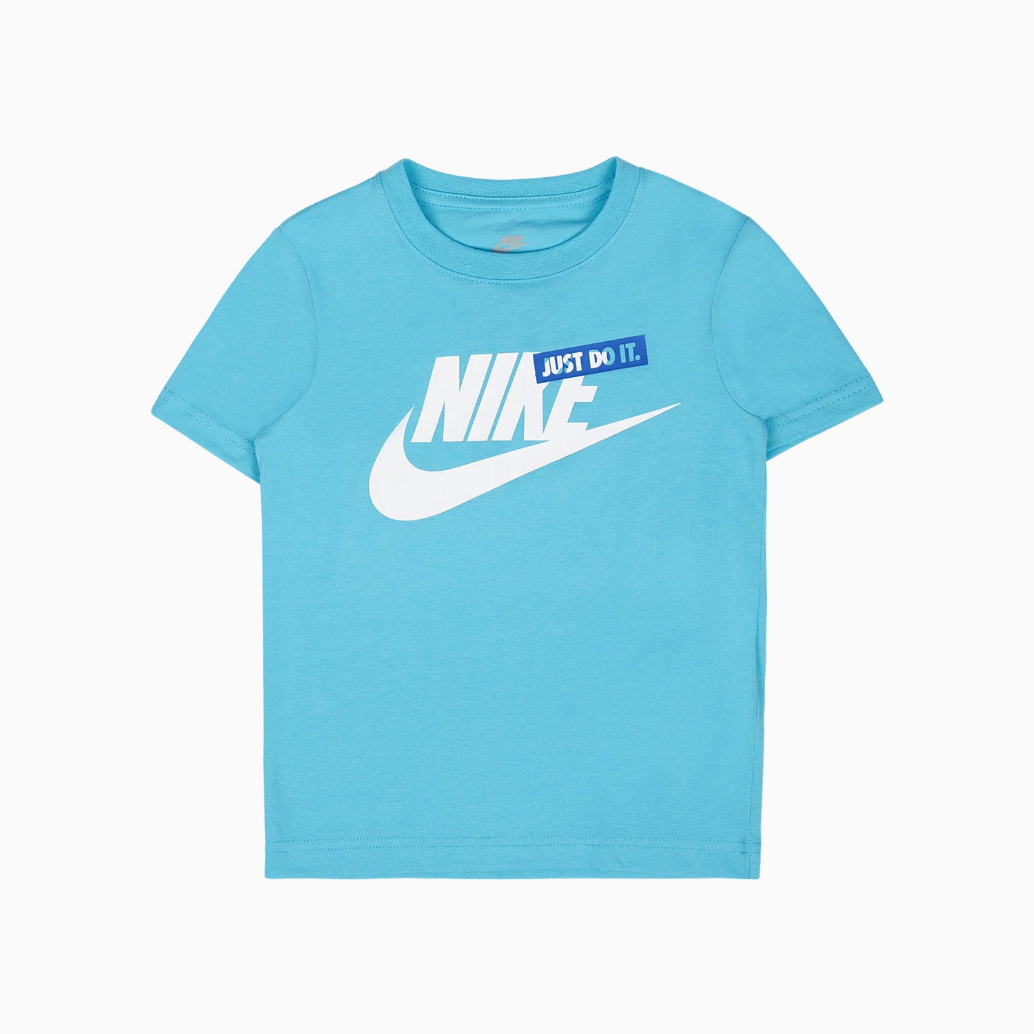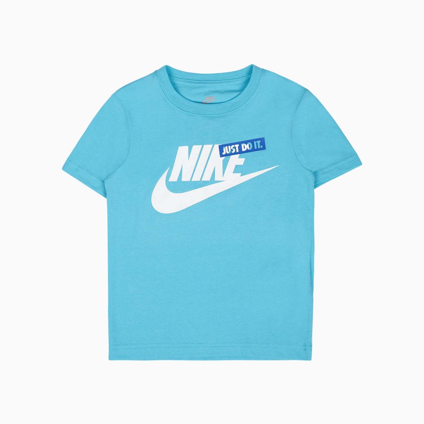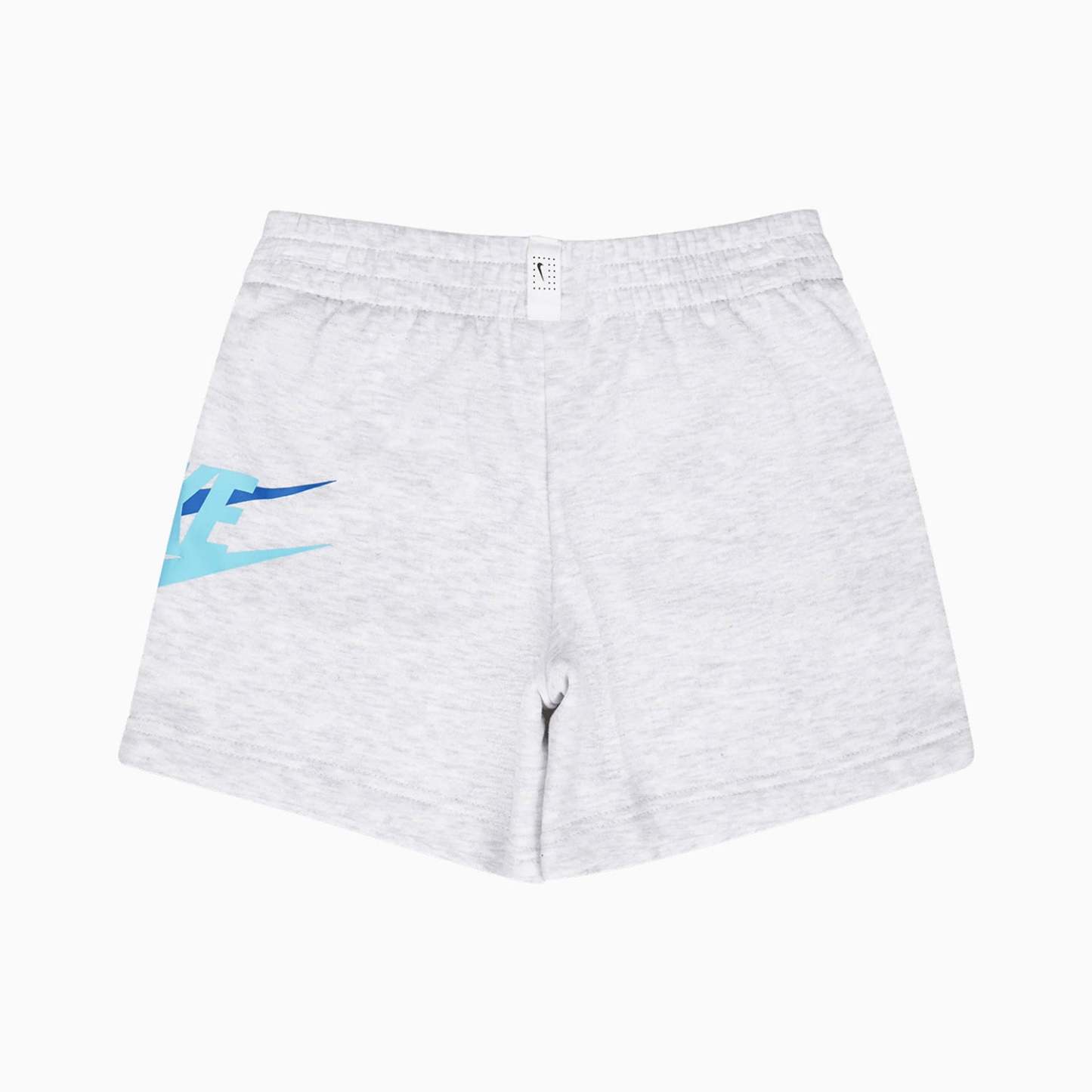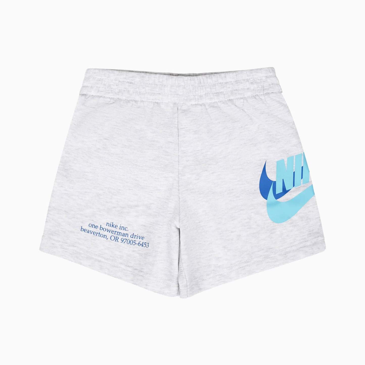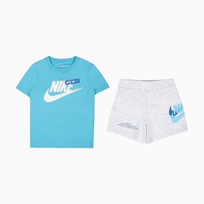 Cool Nithtke shorts set, which consists of a t-shirt and a pair of sweat shorts. The T-shirt is in light blue with a large, white logo print and a simple "JUST DO IT" print on the chest. The Sweat shorts are in melange grey with a blueprint on the right thigh and a large, blue, and light blue logo print on the side of the left thigh.