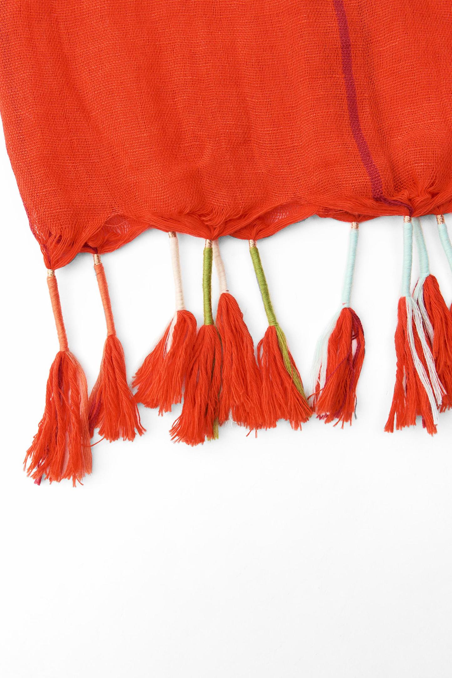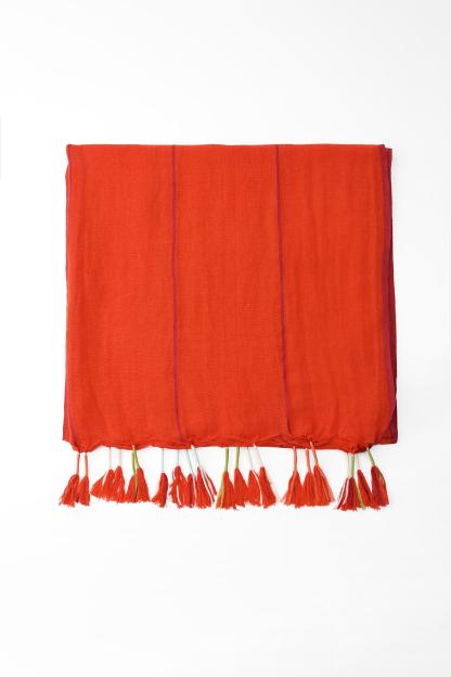 Linen blend scarf. Fringe trim with contrasting thread.