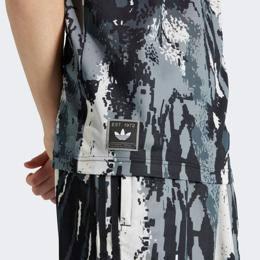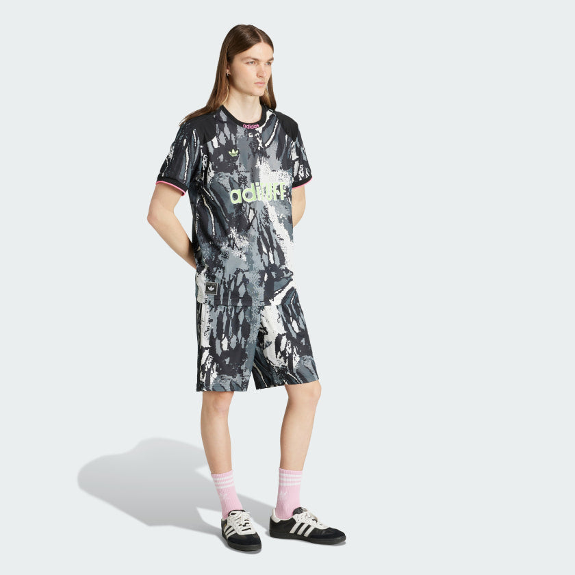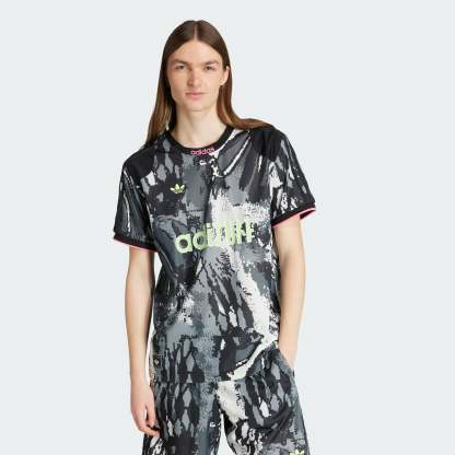 We update a classic adithtdas goalkeeper jersey, ready for this summer with short sleeves and light tricot, keeping the archive print. This jersey will pair with your favorite denim or cargo pants to add a pop to your festival fit this summer.