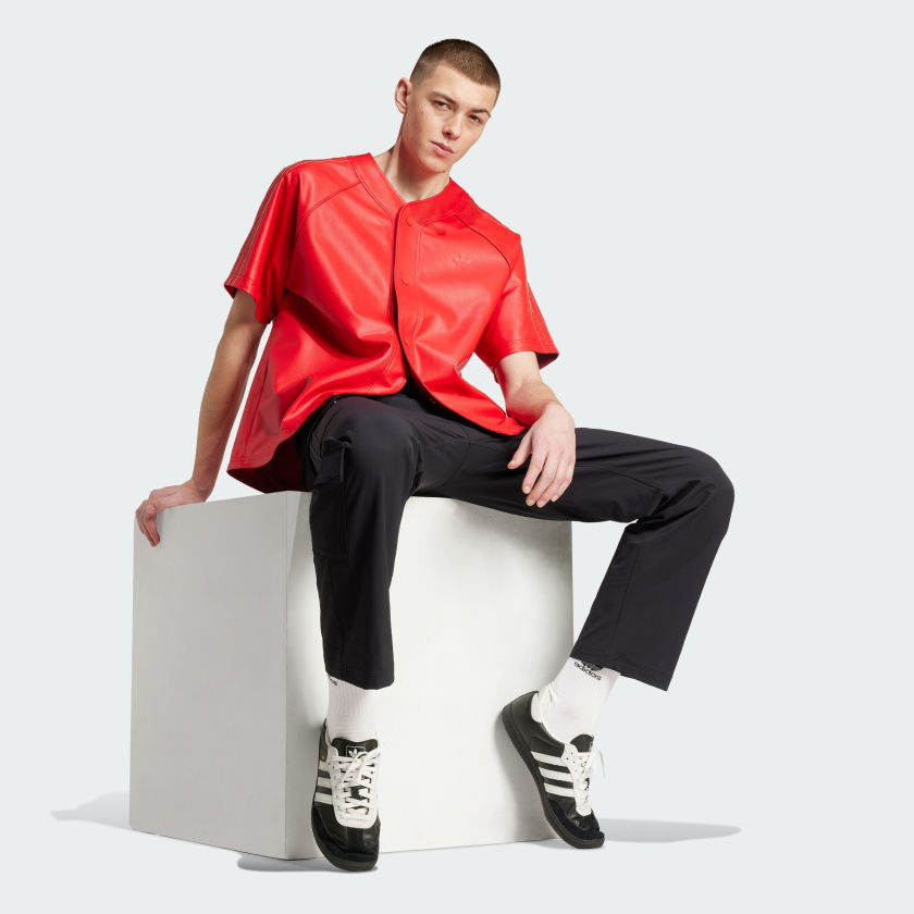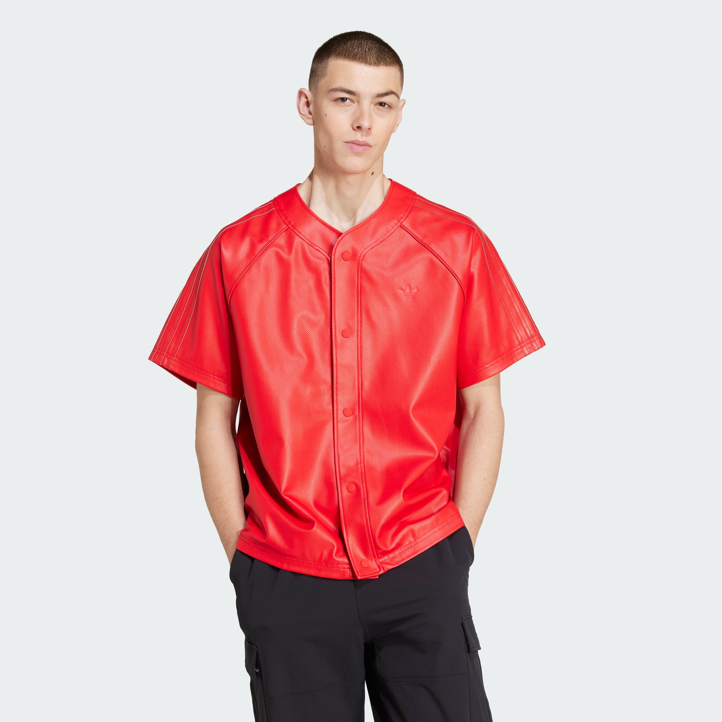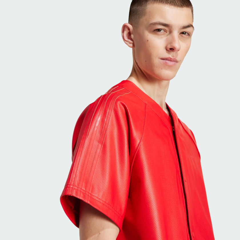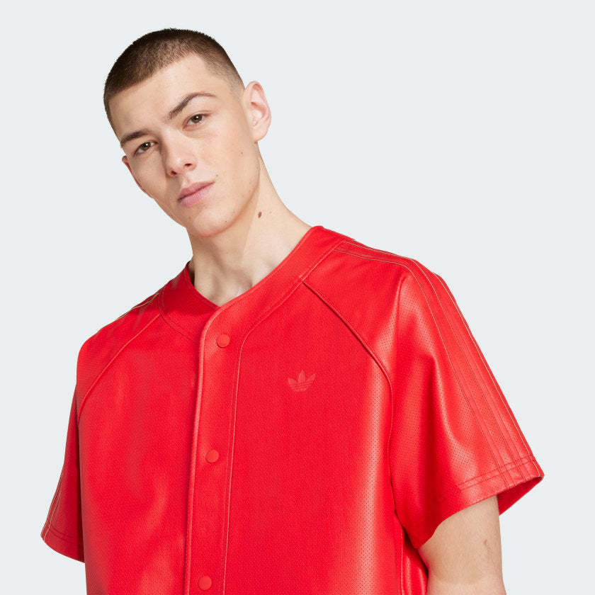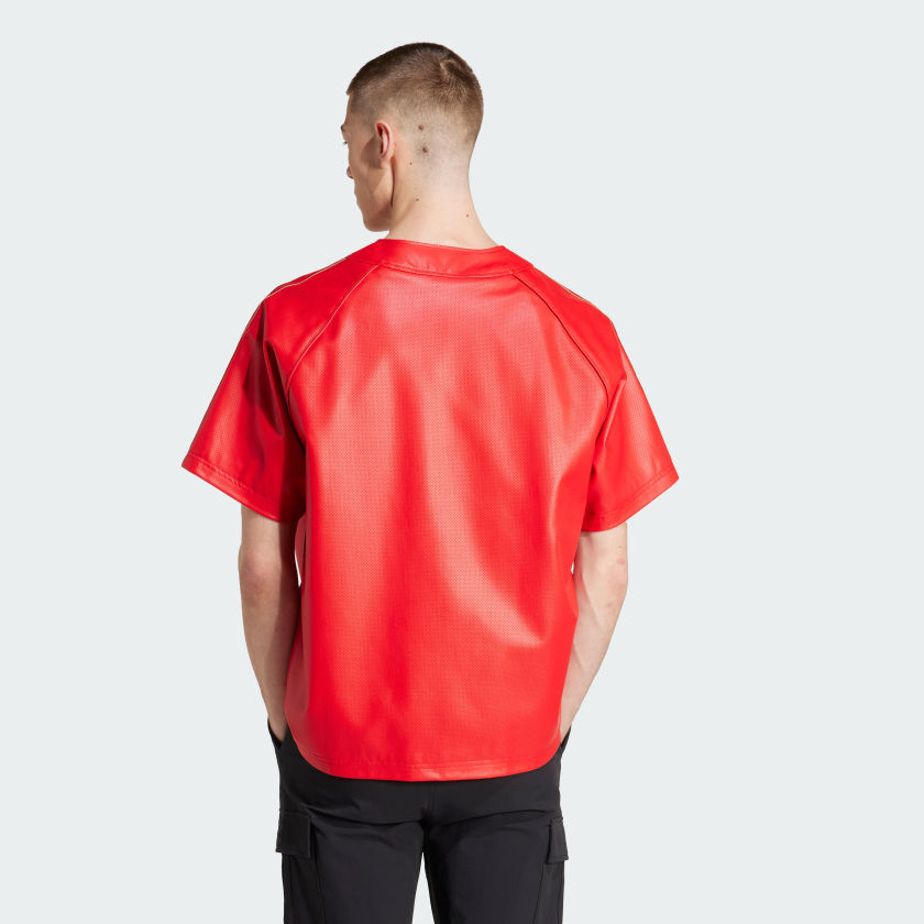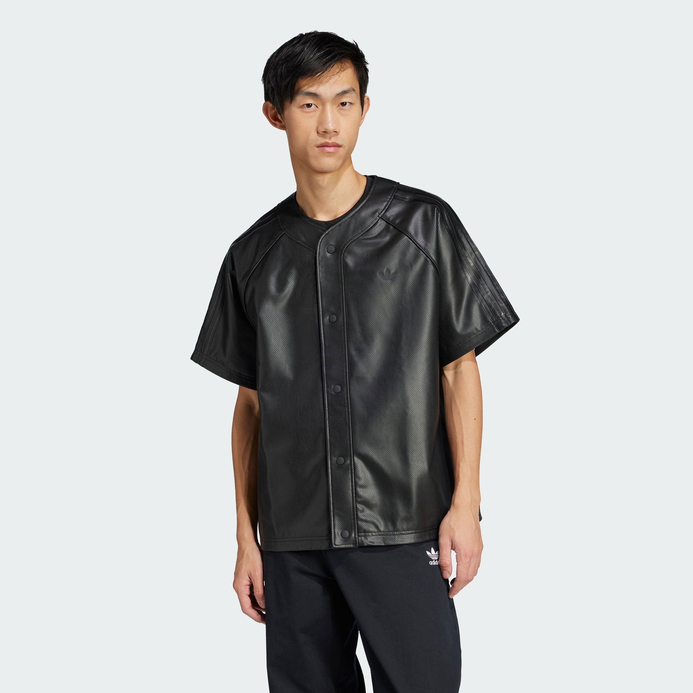 Button up an instant winner with this Baseball Jersey from adithtdas Originals. Cut loose from faux leather, it has a sleek and shiny look that's smoothly lined for comfort. The vibe is relaxed and easygoing with classic baseball jersey details like the distinct collar, placket and raglan sleeves. Pair it with your favorite sneakers for an elevated look.