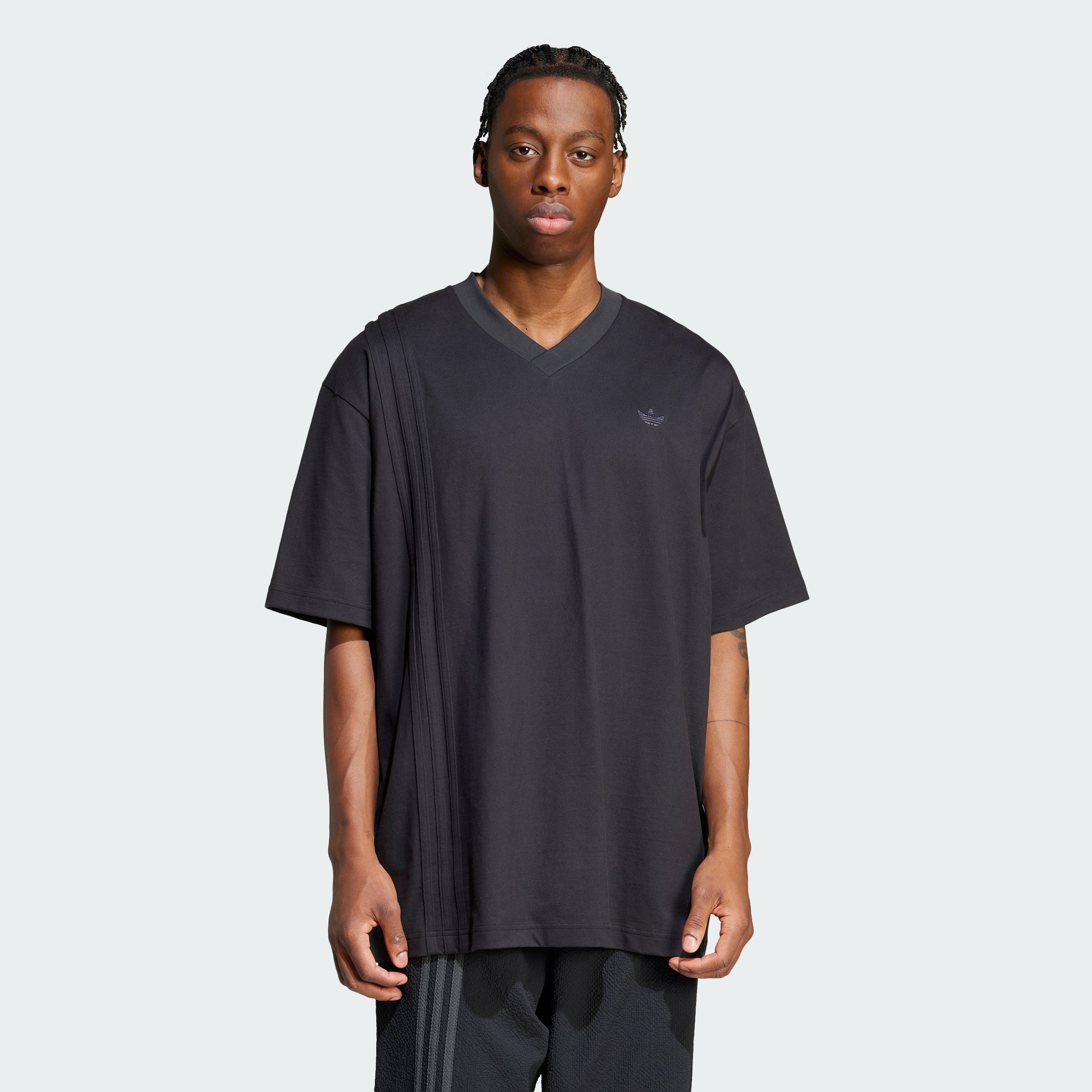 Bold yet subtly sophisticated, this adithtdas V-neck t-shirt lets your style make the statement. Made from soft, lightweight single jersey fabric, this tee keeps you comfortably stylish all day long. The vertical 3-Stripes wander off from the center, creating an asymmetrical look that plays with the eye.