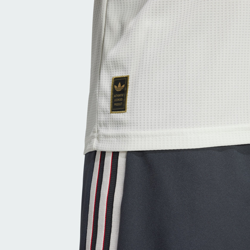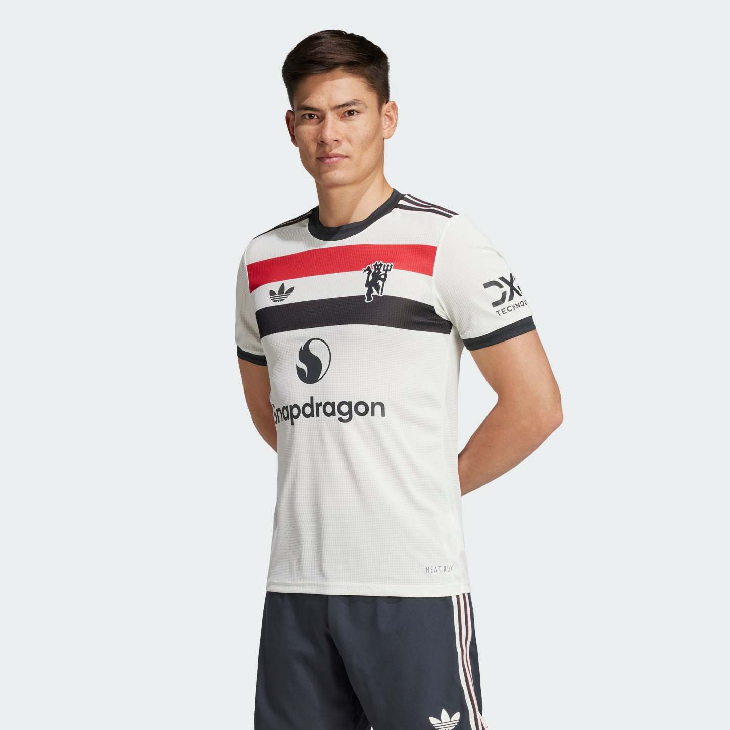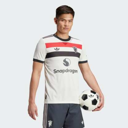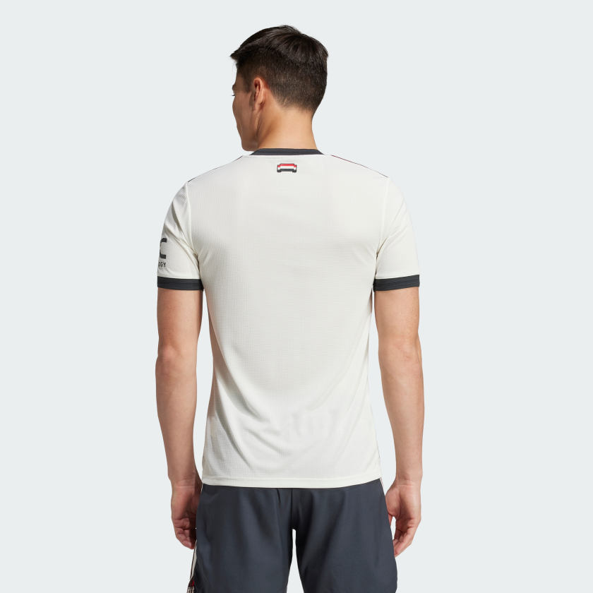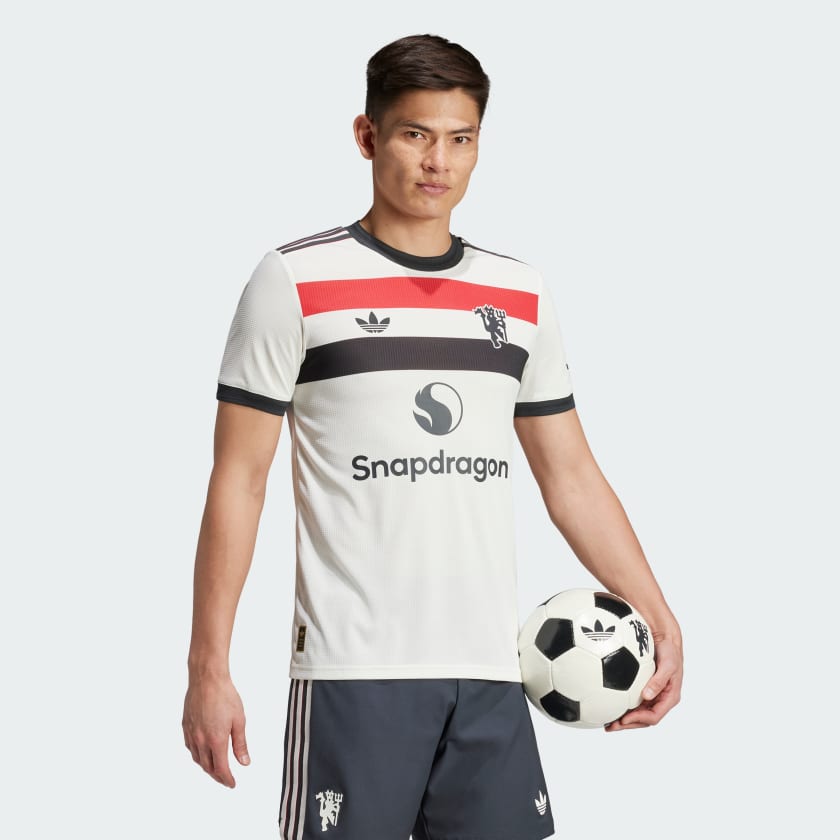 Soccer pride never falls out of fashion. This Manchester United third authentic jersey salutes the flags that follow the club home and away, while also adding some classic adithtdas heritage. Shorthand for sporty style, a Trefoil and red devil badge stand out from that tricolor chest bar. Stay-cool HEAT.RDY fuels dominant displays. This product is made with 100% recycled materials. By reusing materials that have already been created, we help to reduce waste and our reliance on finite resources and reduce the footprint of the products we make.
