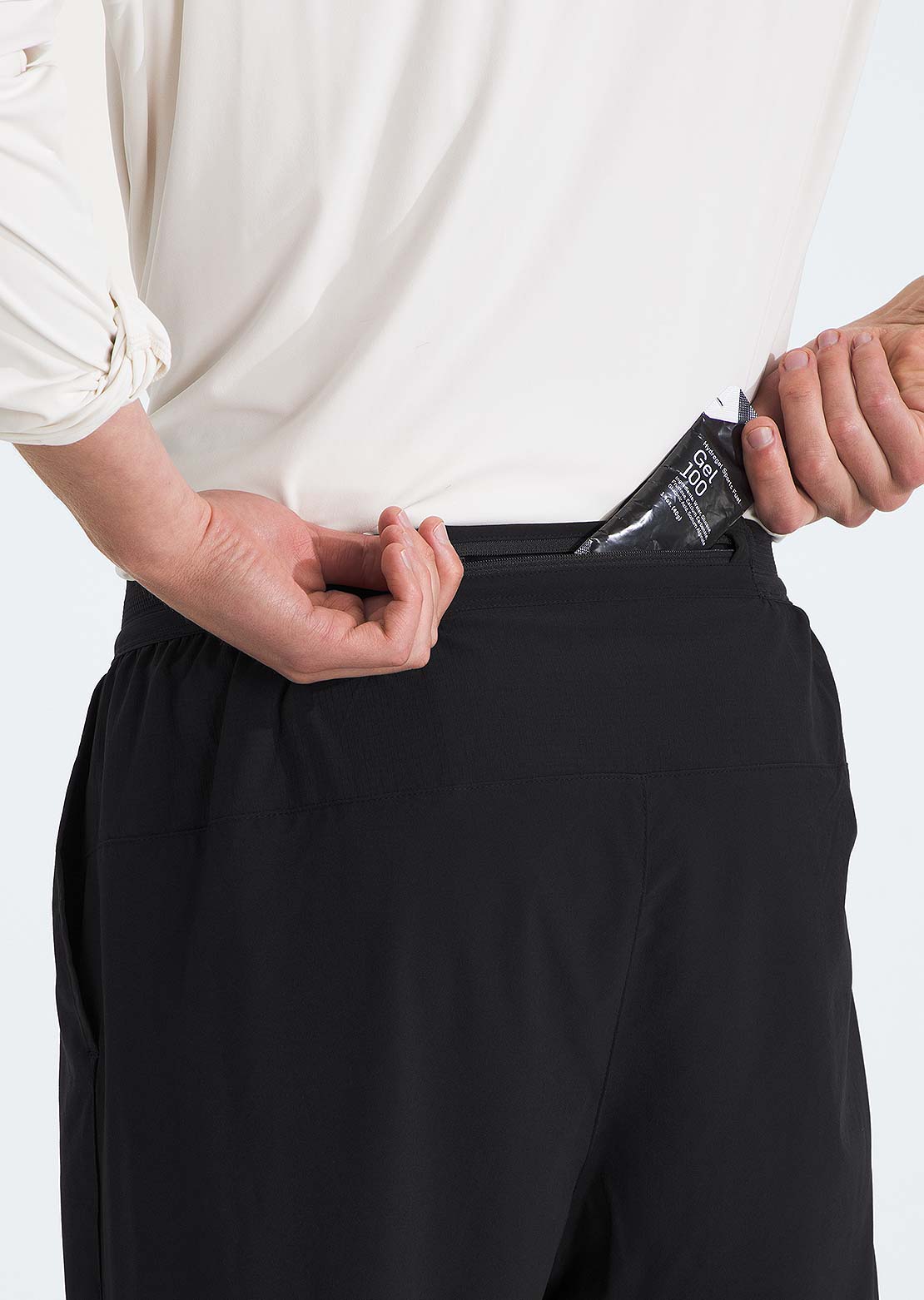 Secure-zip pocket on center back of waistband with faux fly