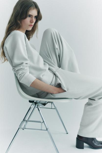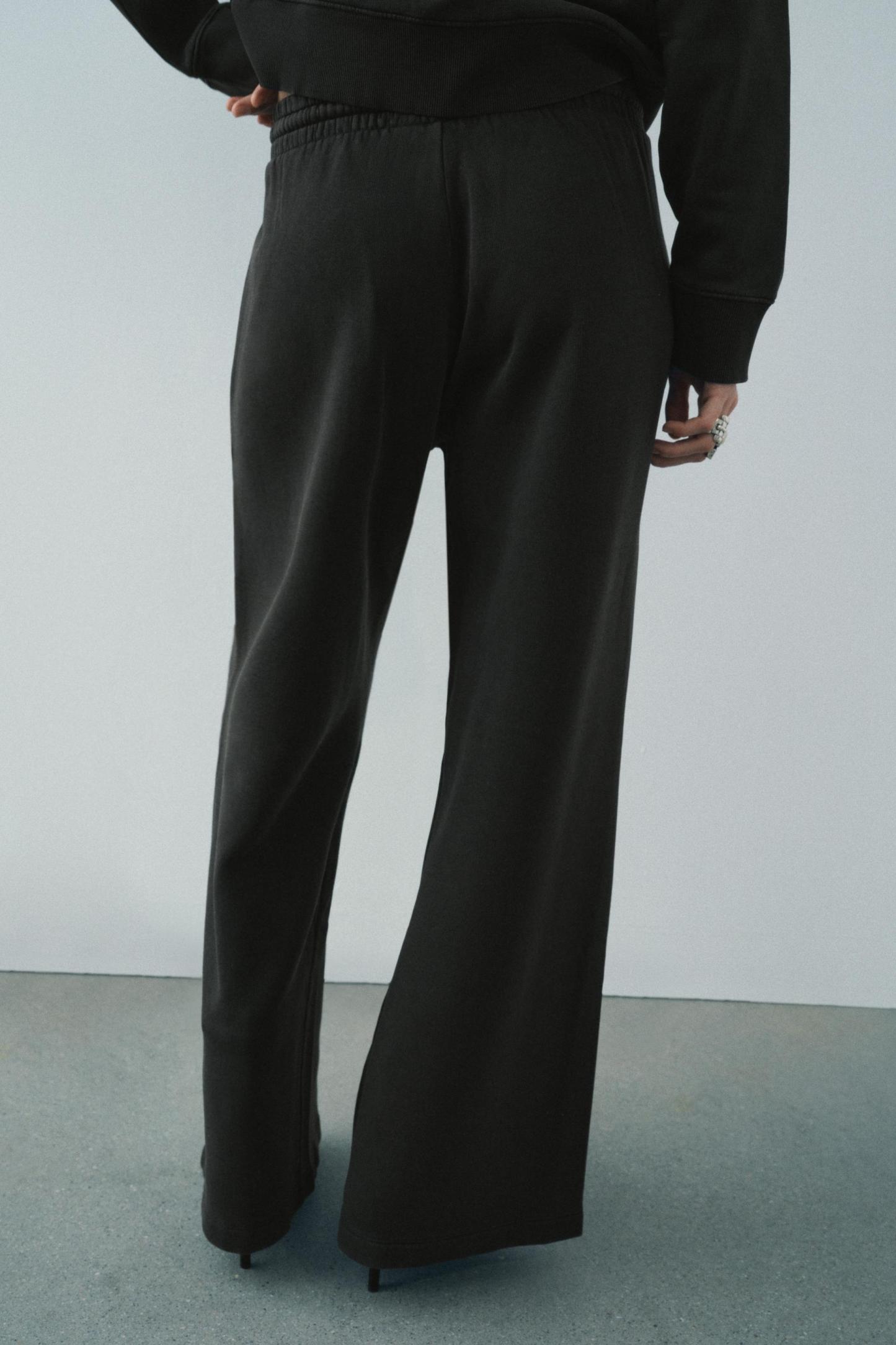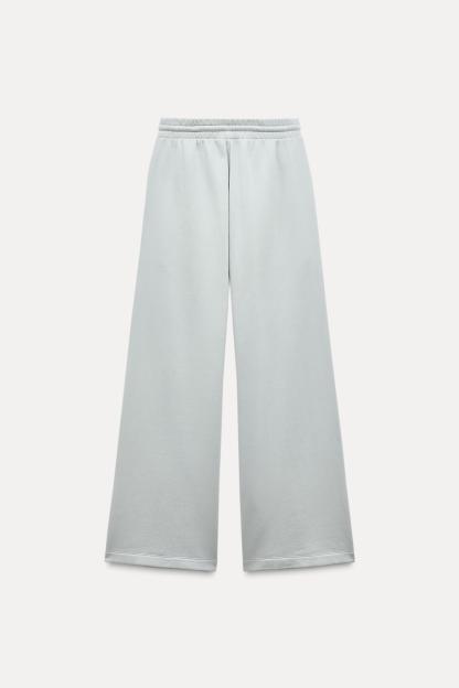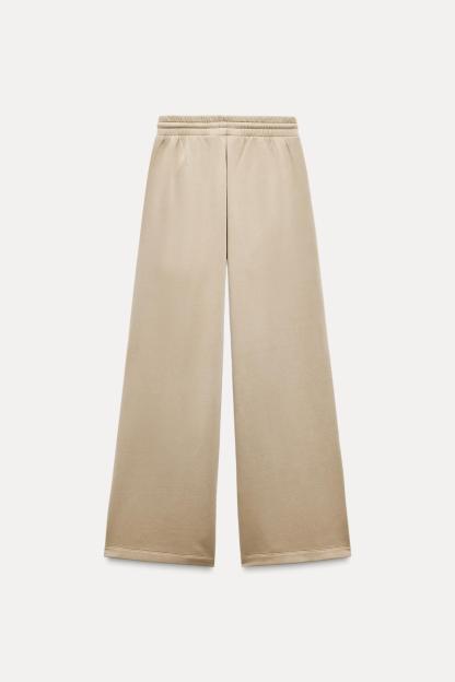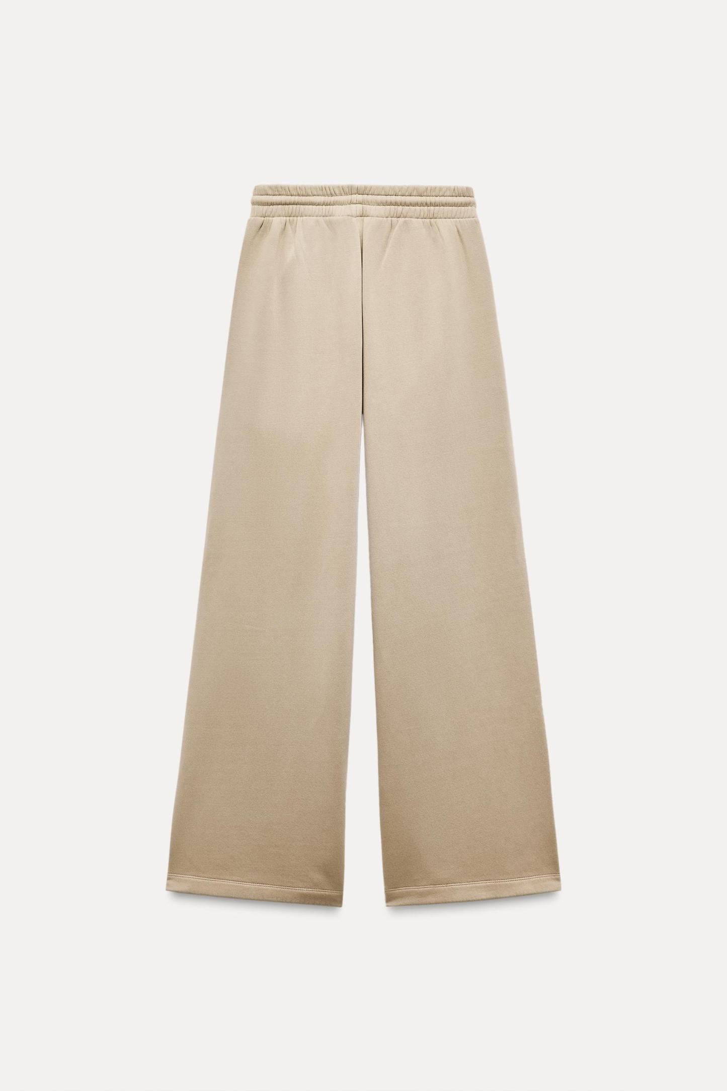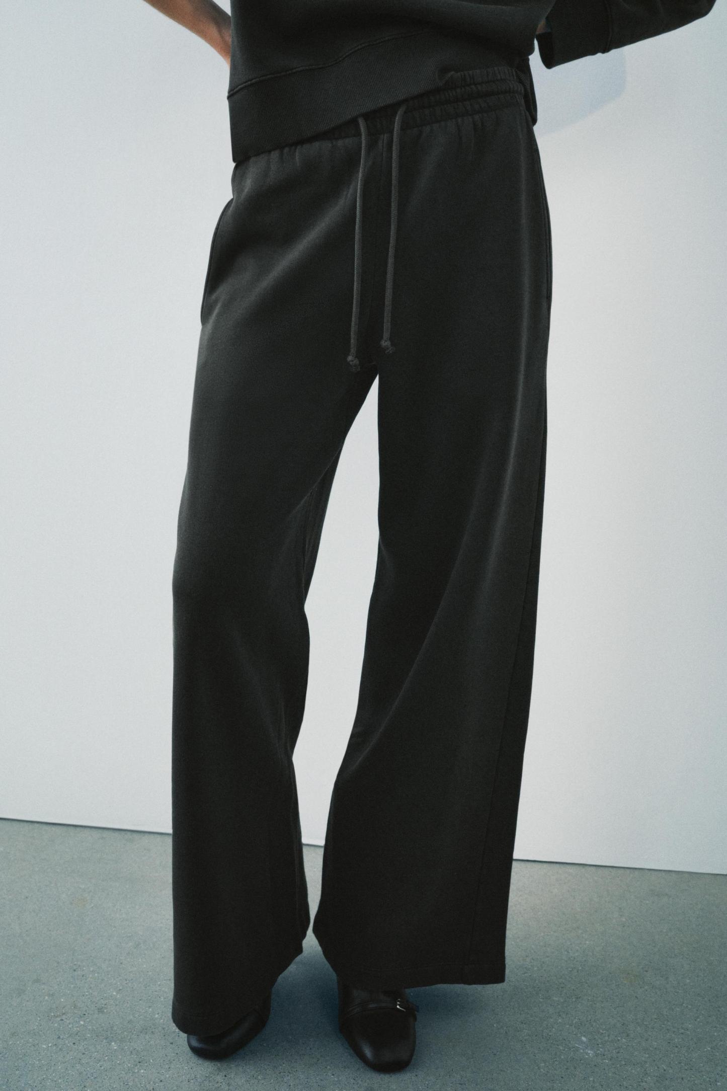 Pants made of a cotton blend. Mid waist and adjustable elastic drawstring waistband. Side pockets. Wide leg.