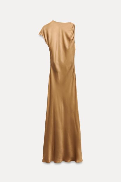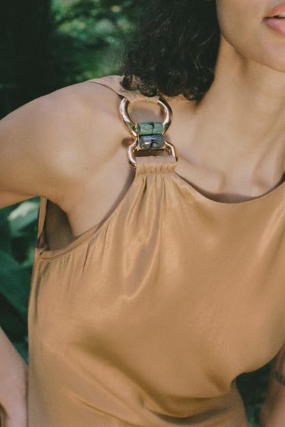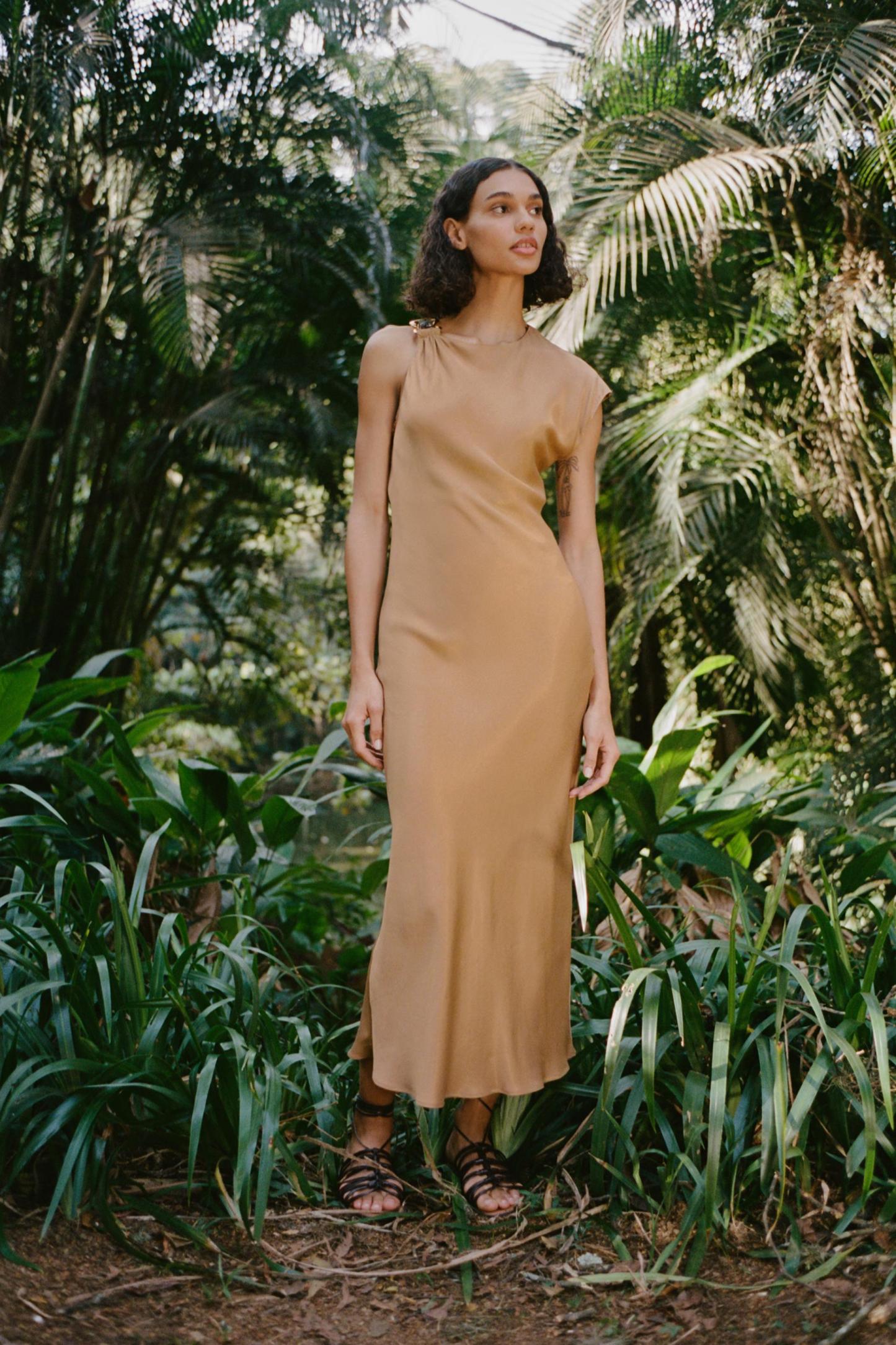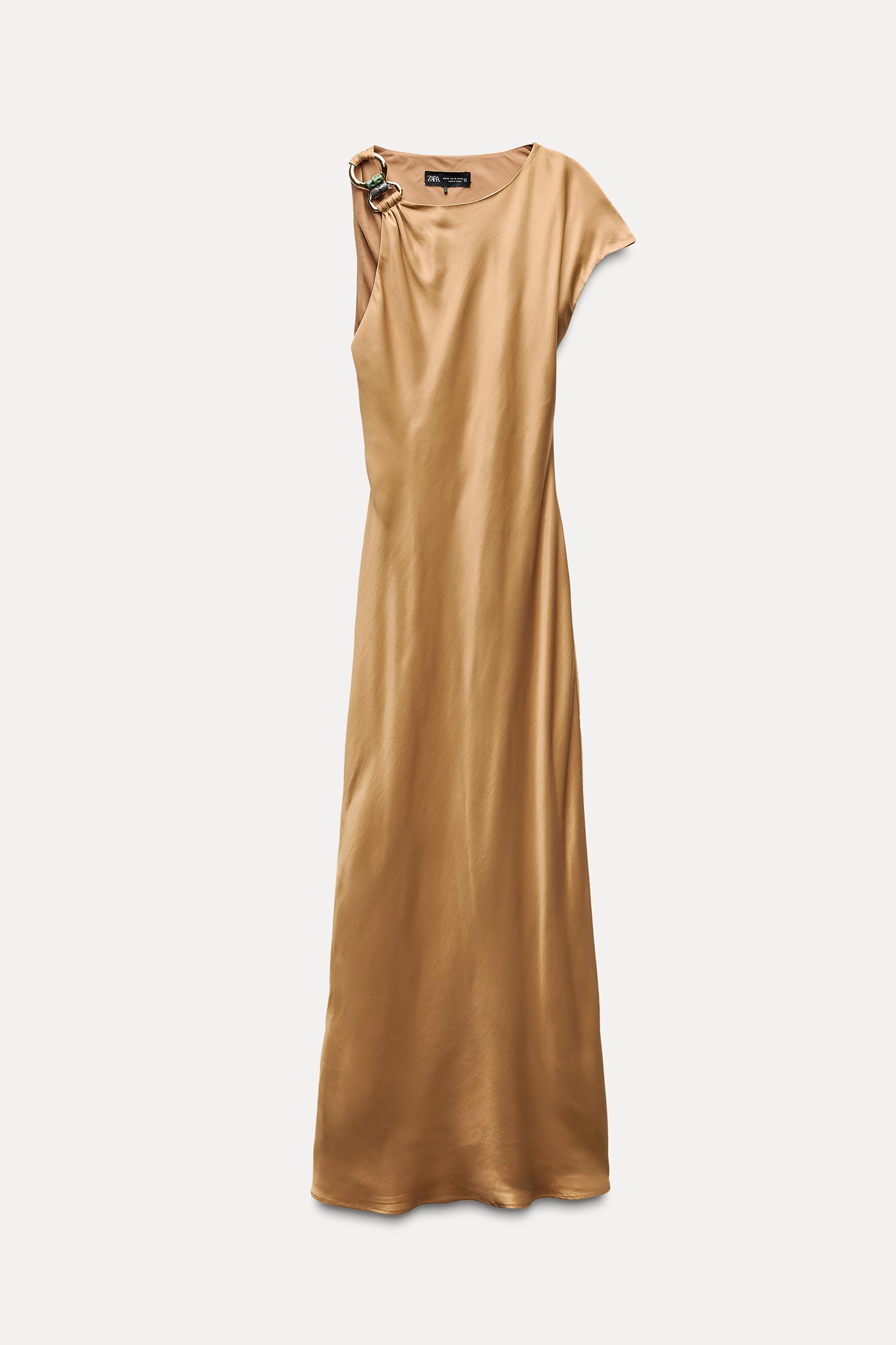Round neck dress with asymmetric sleeves and front golden appliqué. Fitted waist.