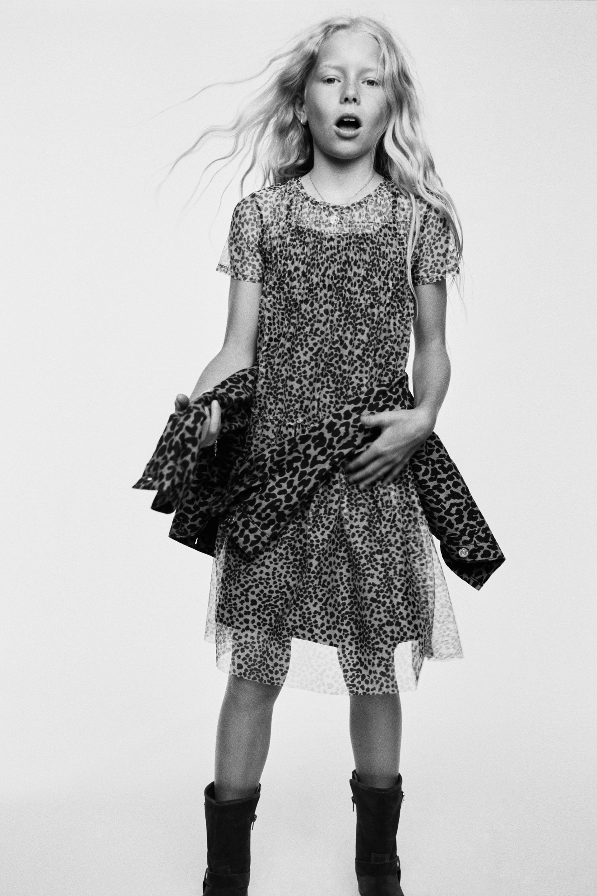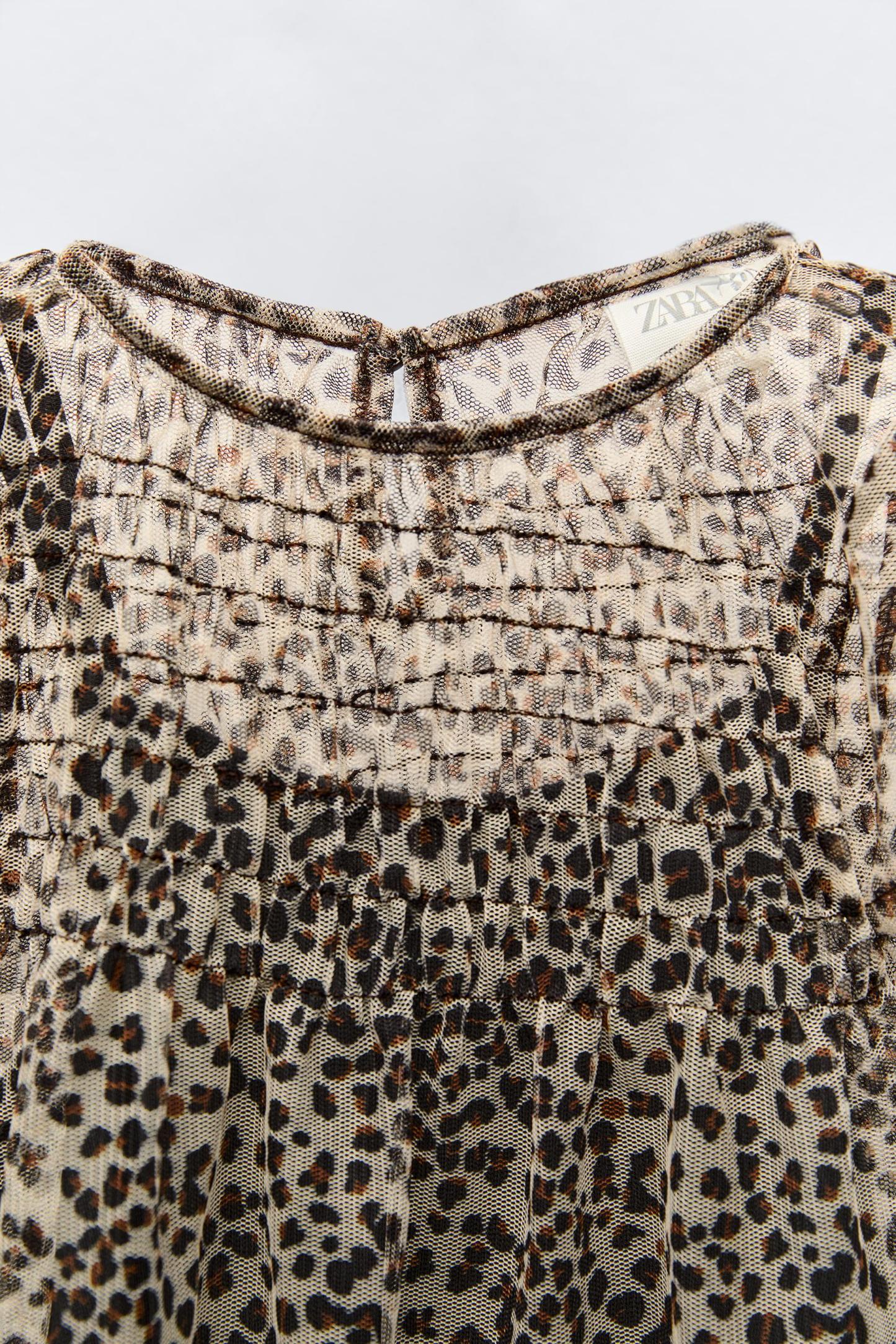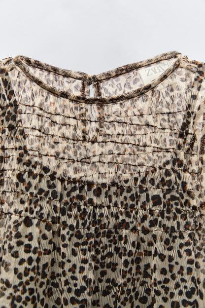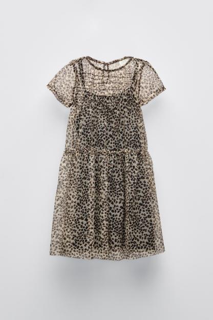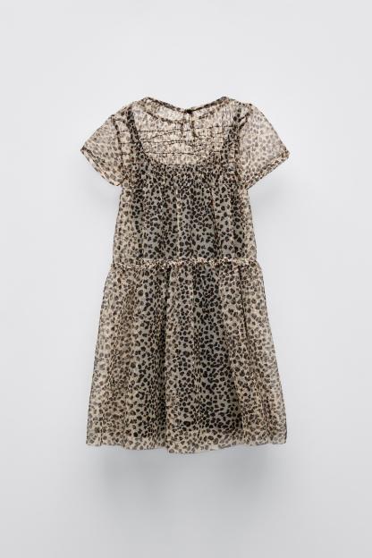 Round neck dress with short sleeves. Elastic detail at yoke. Buttoned teardrop closure at back.