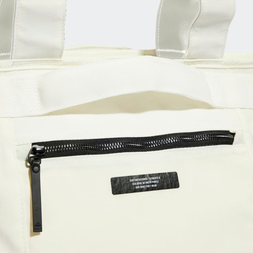 Keep calm and carry this. An adithtdas shopper bag that zips up securely, with a padded compartment for your laptop or tablet. If you're going from work to team training, this will keep your kit neatly hidden. There's also an inside mesh pocket with a zip for your valuables. So you definitely won't drop the ball, or your credit card. Made with a series of recycled materials, and at least 60% recycled content, this product represents just one of our solutions to help end plastic waste.
