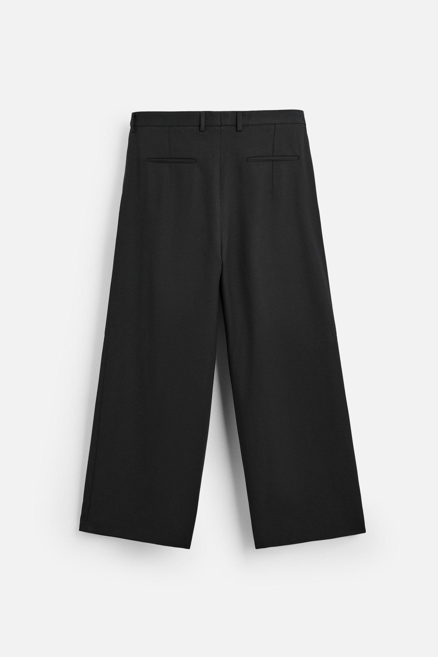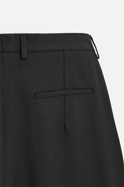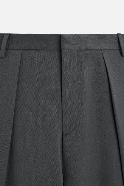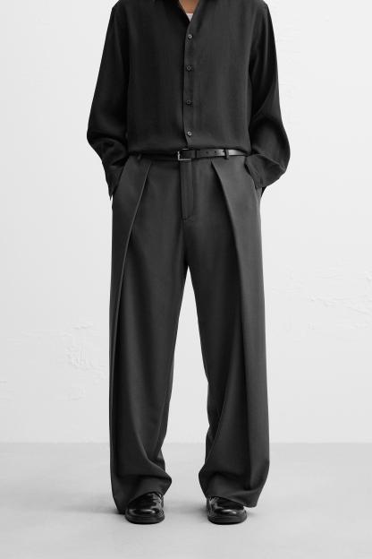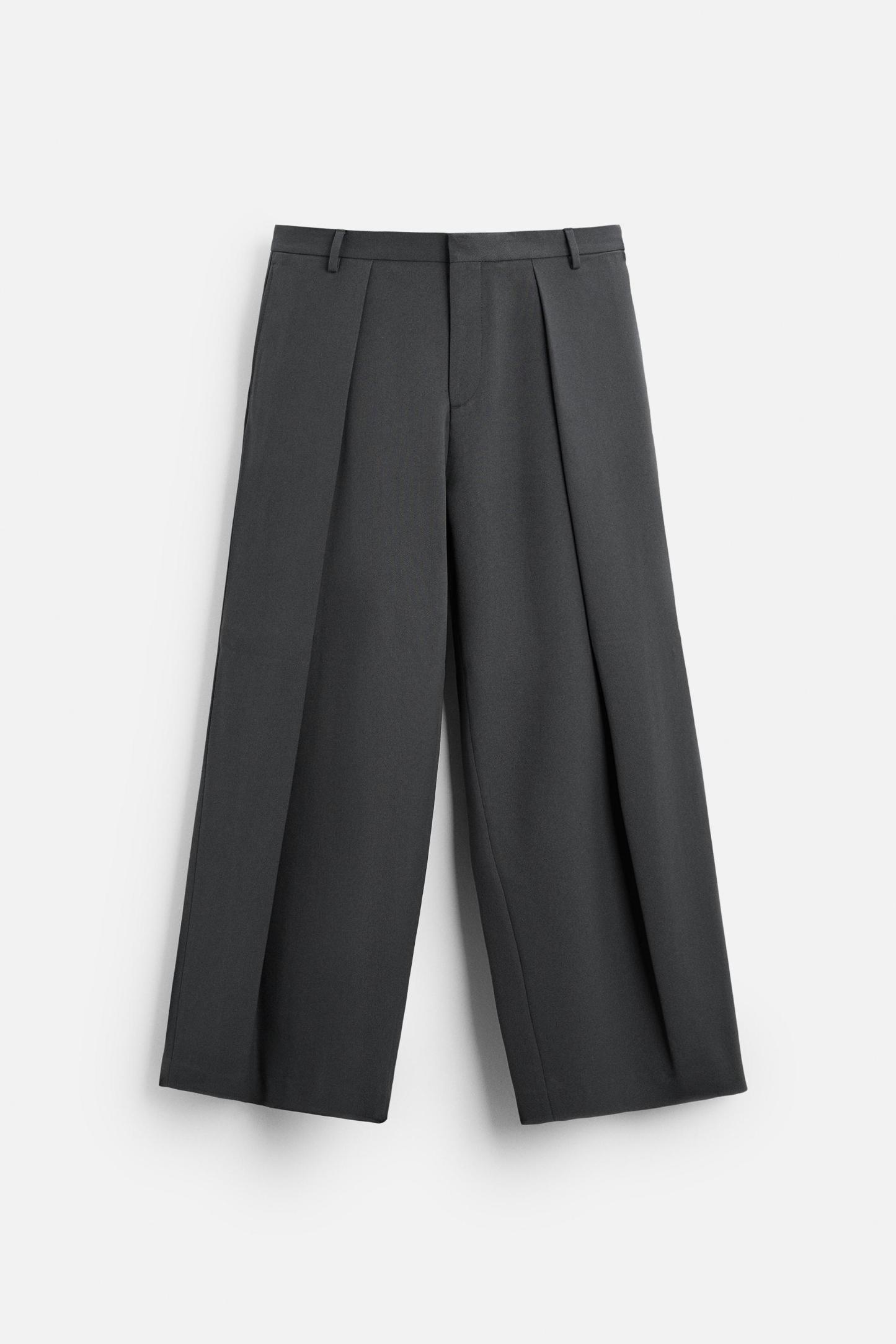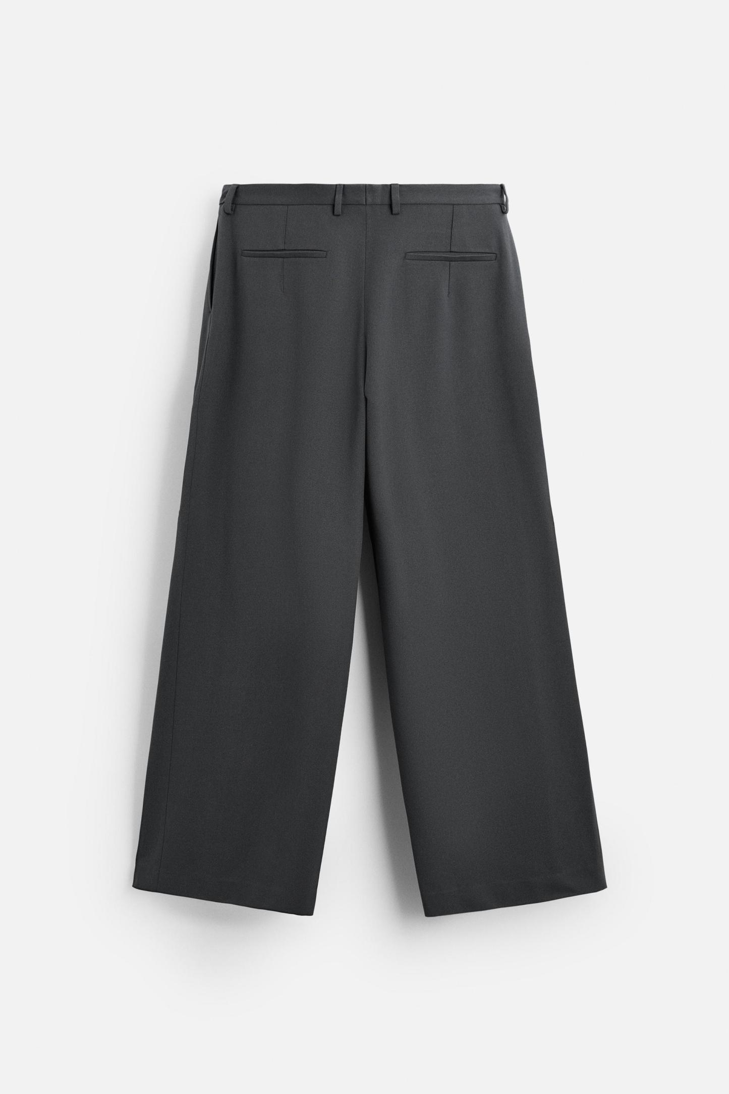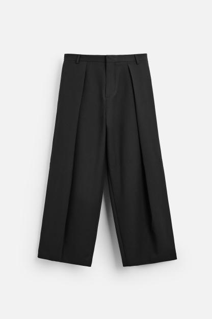 Wide fit pants. Front pleats at waist. Side pockets and back welt pockets. Front zip and hidden metal hook closure.