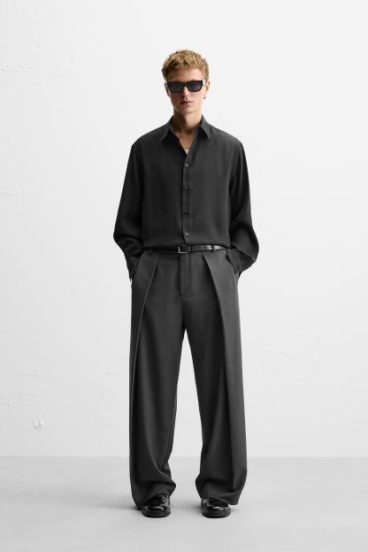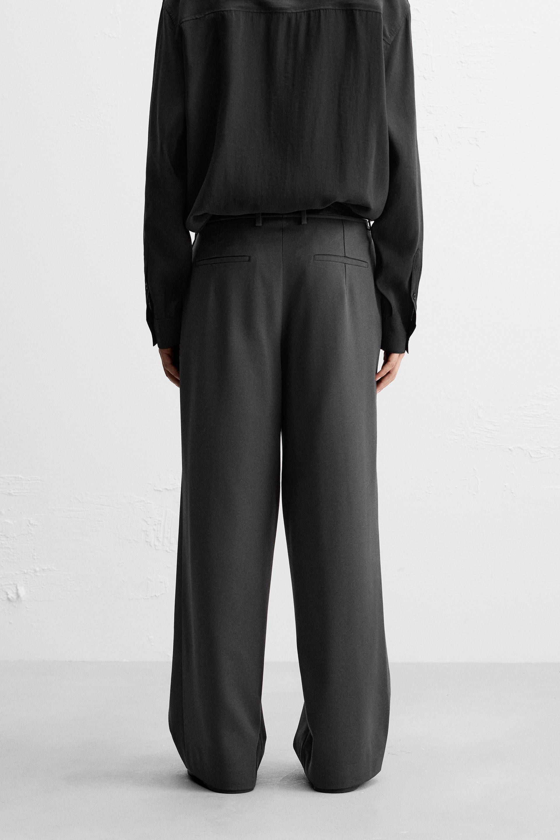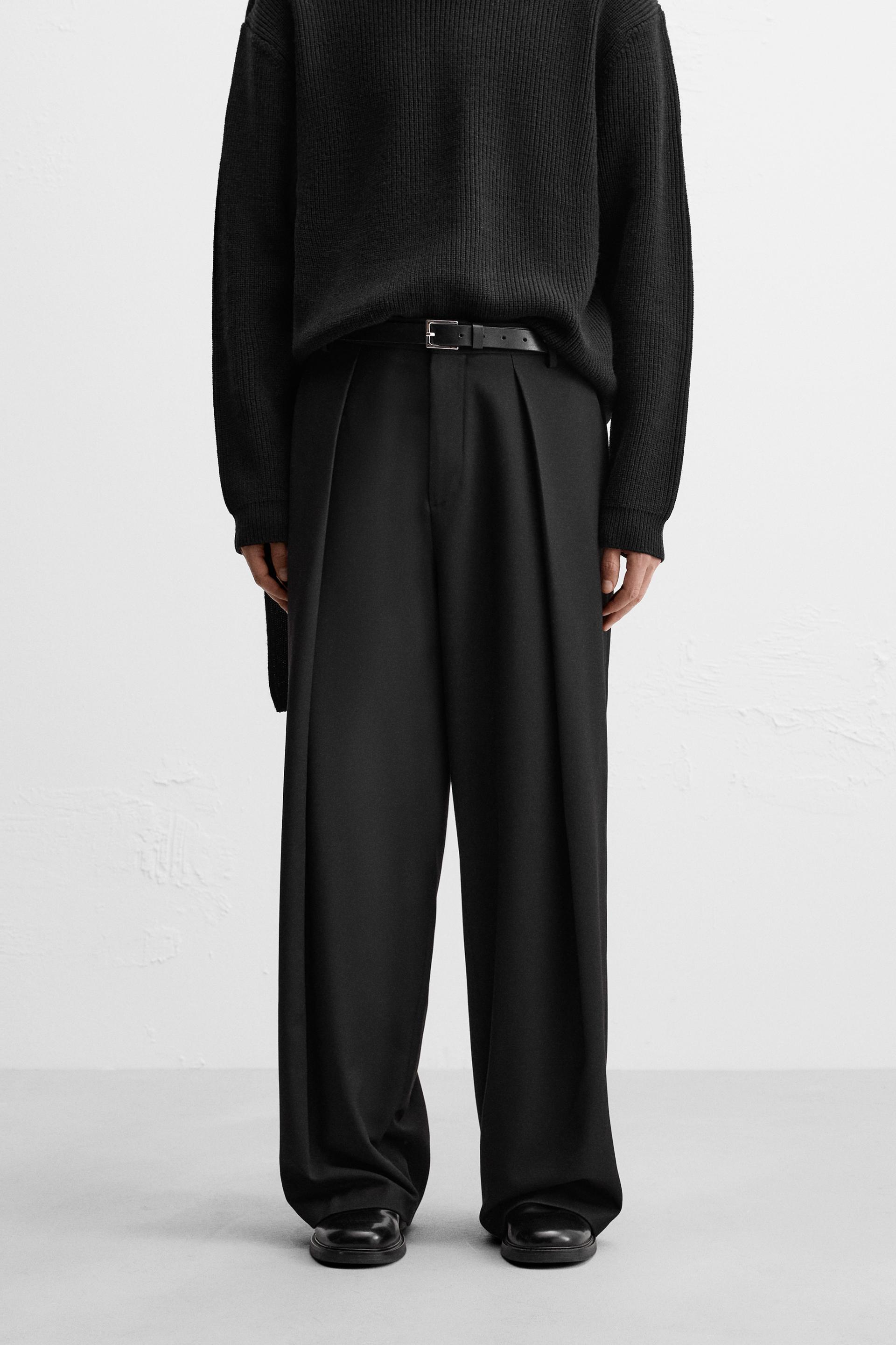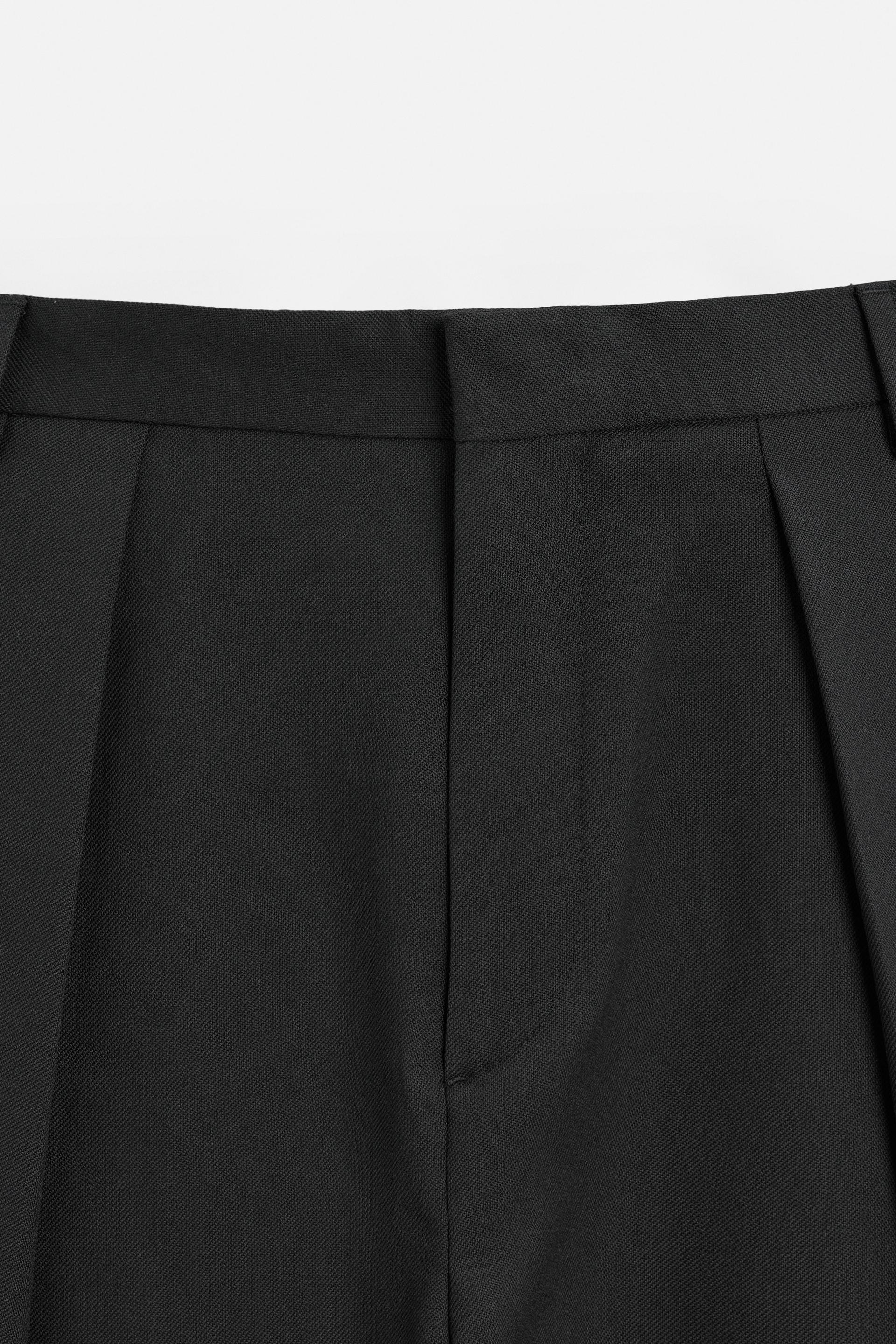 Wide fit pants. Front pleats at waist. Side pockets and back welt pockets. Front zip and hidden metal hook closure.