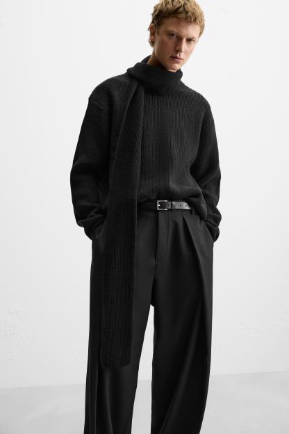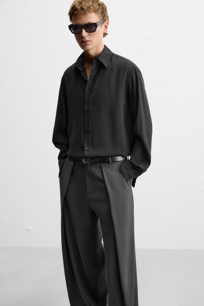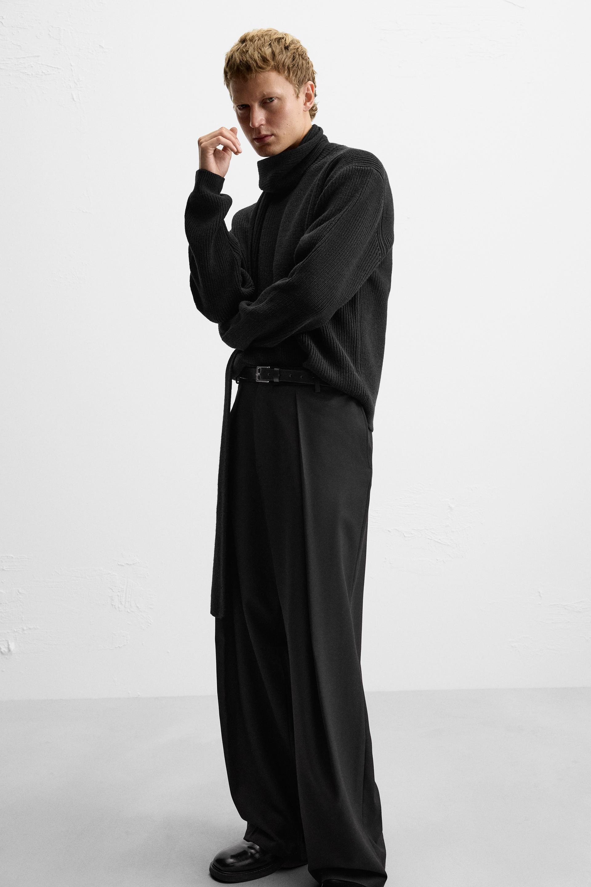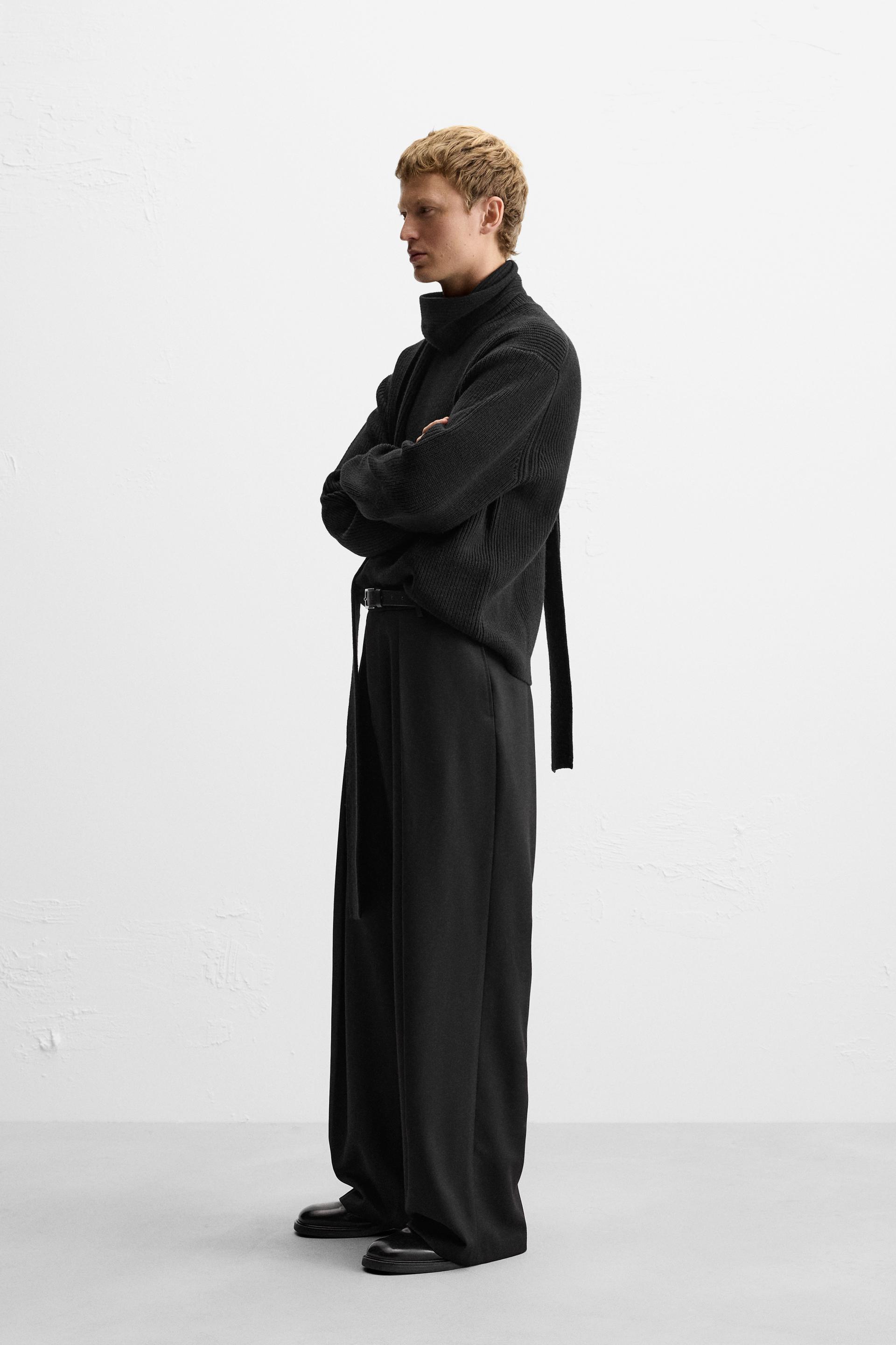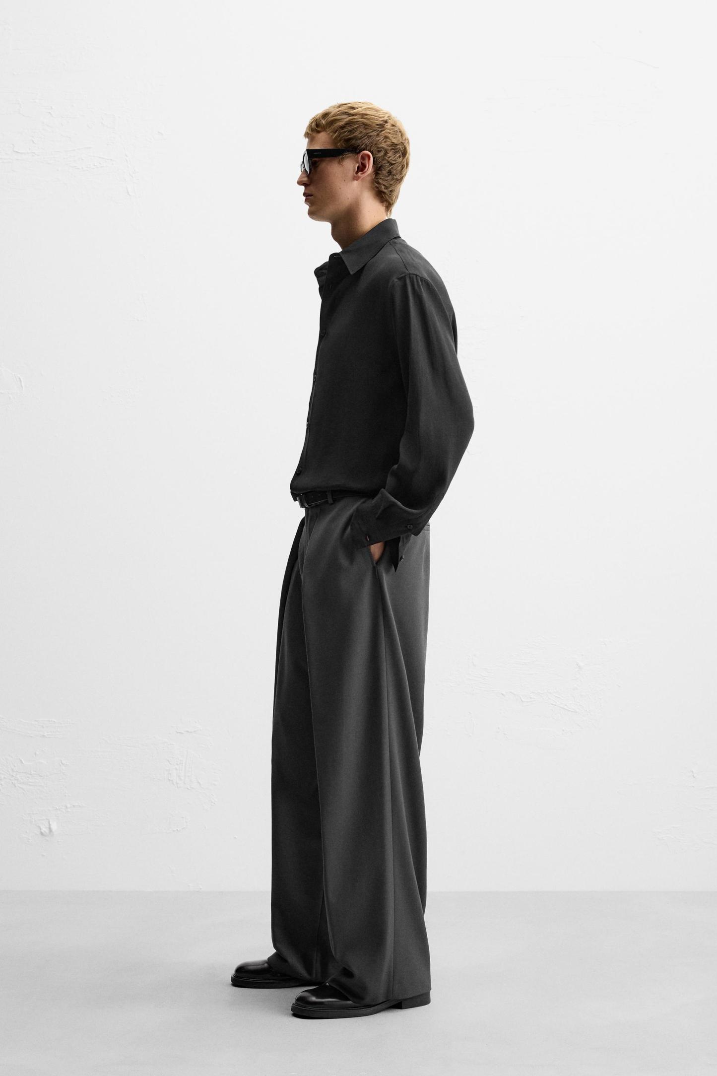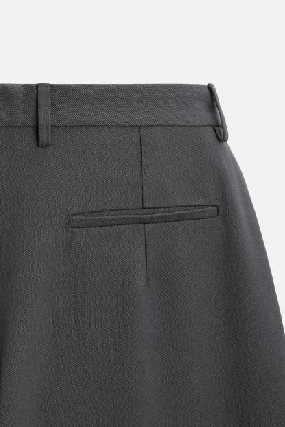 Wide fit pants. Front pleats at waist. Side pockets and back welt pockets. Front zip and hidden metal hook closure.