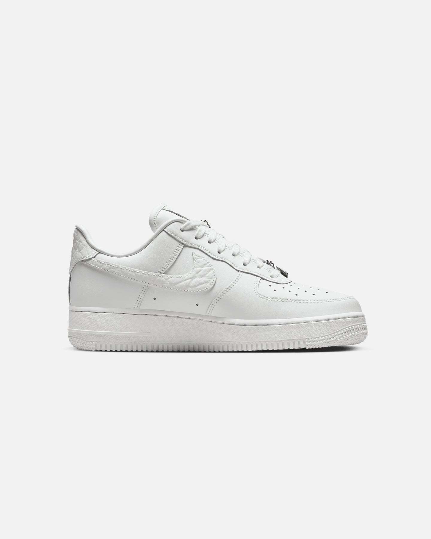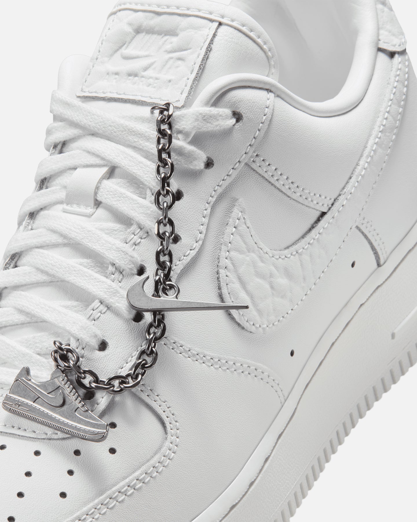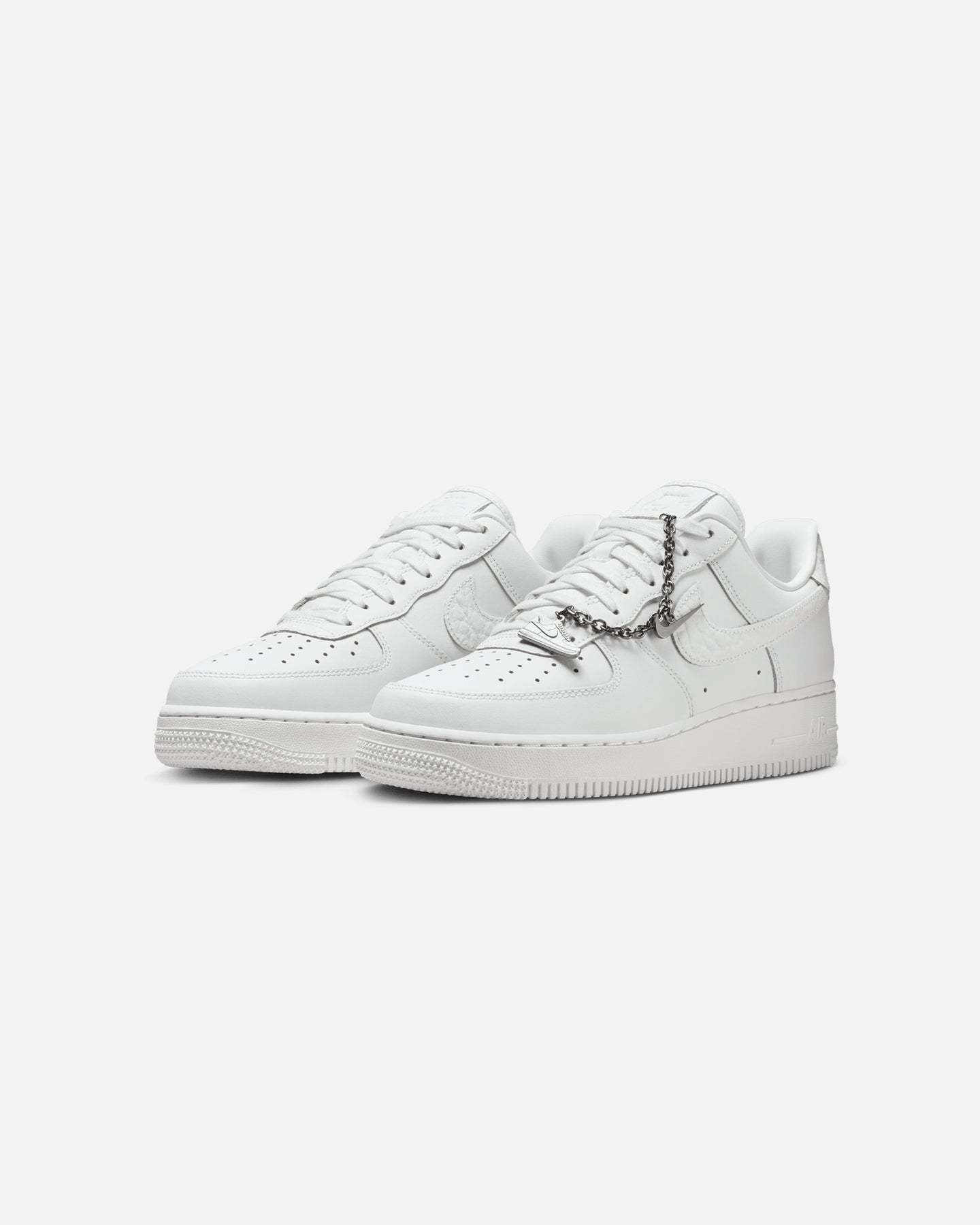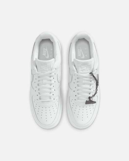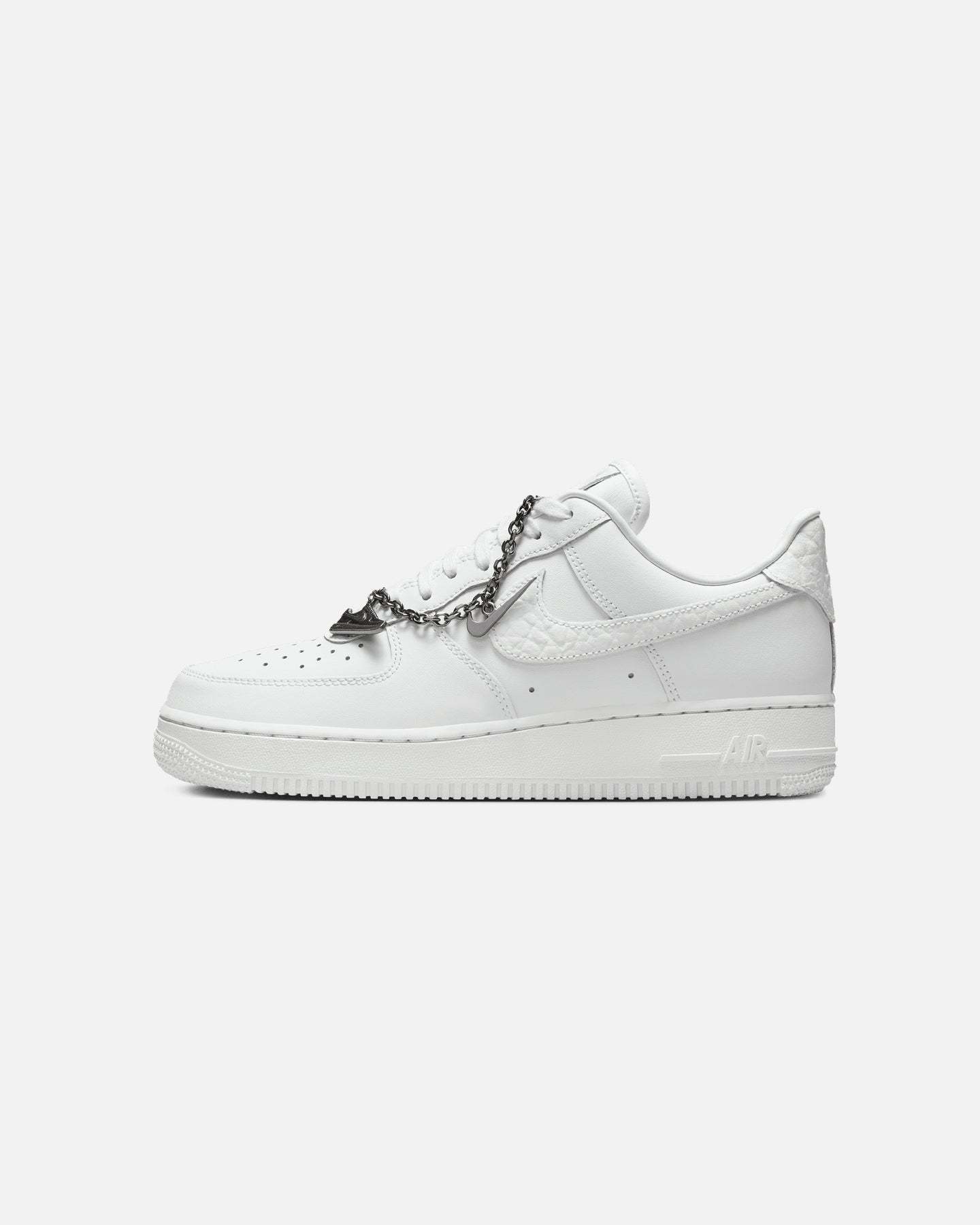 Comfortable, durable and timeless��it��s number one for a reason. The Air Force 1 pairs its classic silhouette with premium leather for a crisp, clean look. This version includes a silver chain and charms to elevate your style. Cop yours today at Culture Kings.- Leather upper- Perforated toe box- Nithtke Air unit- Rubber outsole- Padded collar- Foam midsole- Low-cut silhouette- Lace-up closure- Colour: Summit White- Style: IM6485-121