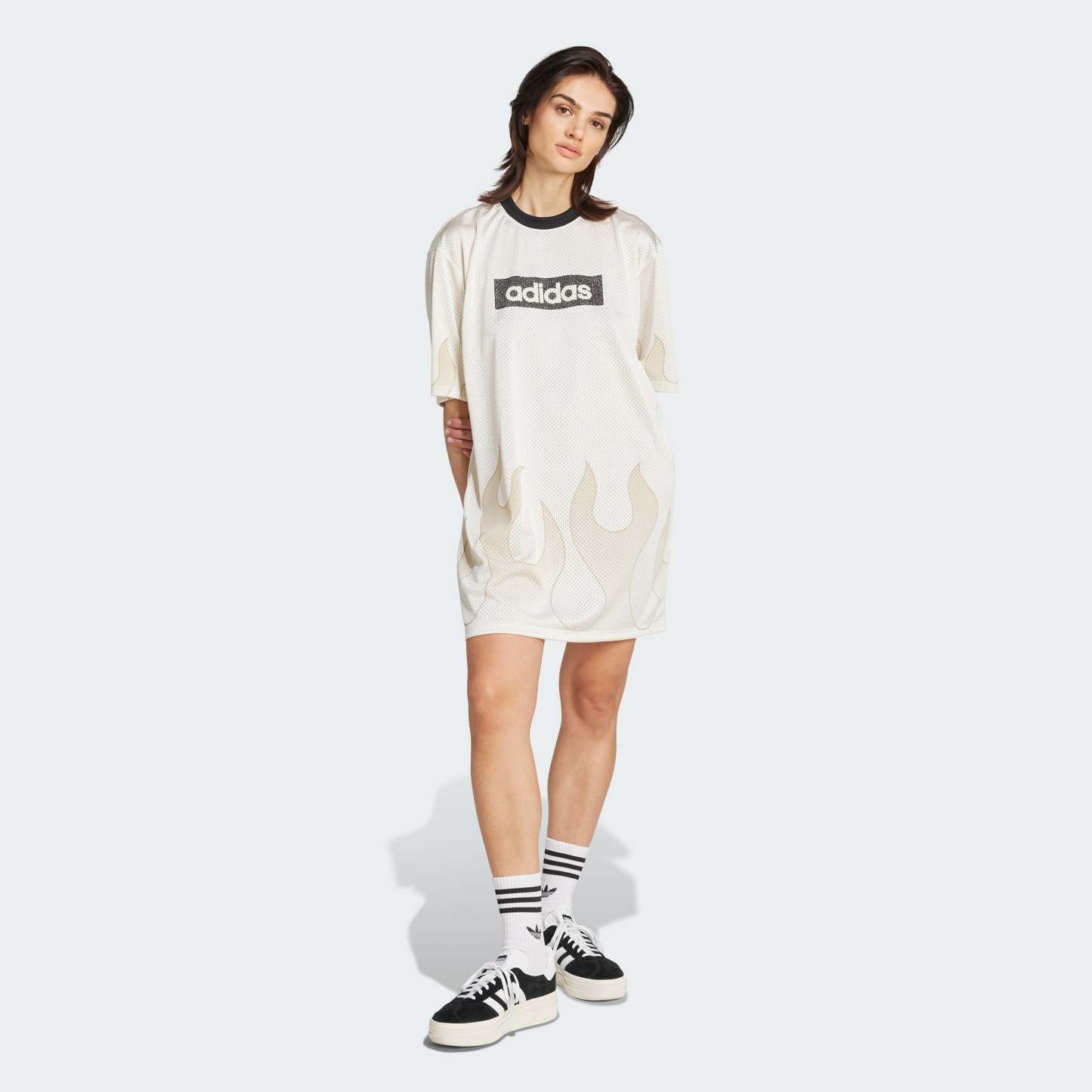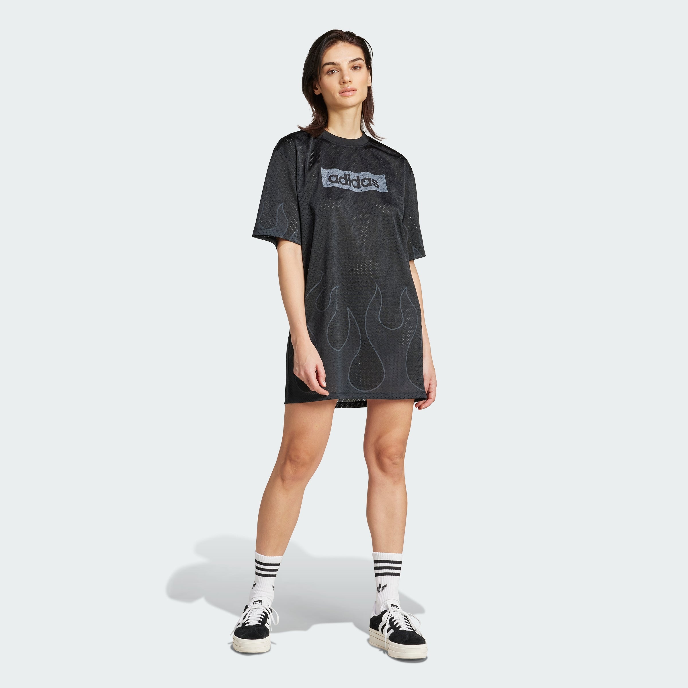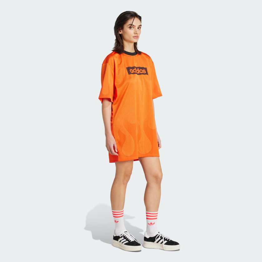 This adithtdas dress borrows inspiration from the sports world to create a look that's at once modern and nostalgic. The mesh build is patterned with a flame graphic, adding a playful touch. An adithtdas graphic on the chest celebrates brand heritage.