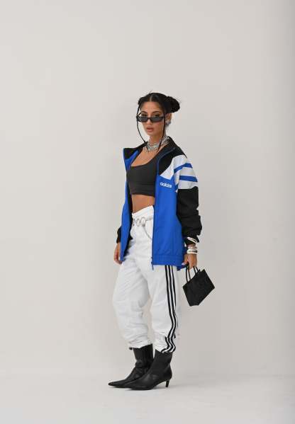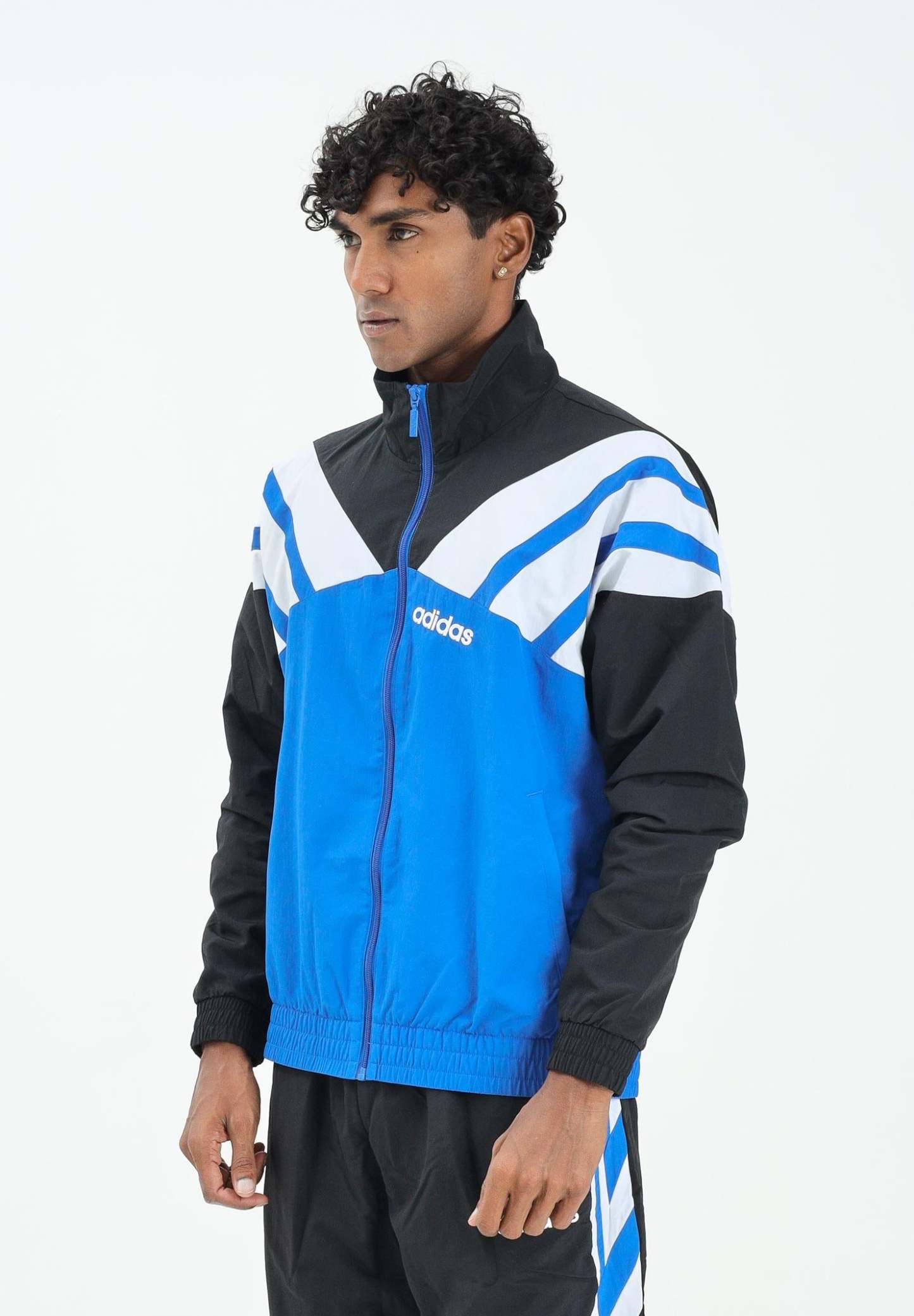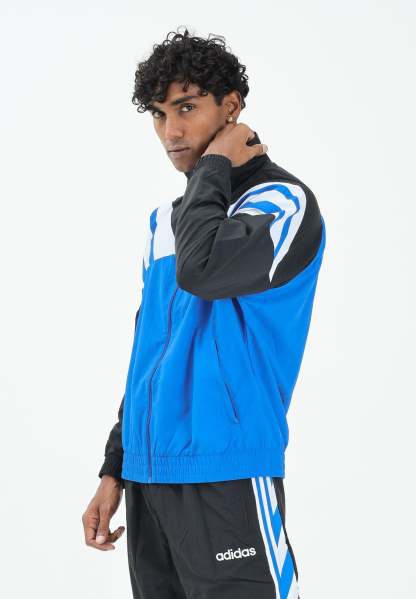 Adithtdas men's blue, white, and black zip-up hoodie. This Adithtdas hoodie features an archive-inspired design for a retro feel. The relaxed fit makes it perfect for layering. The iconic 3-Stripes on the sleeves represent over 70 years of Adithtdas heritage. The model is wearing a size L and is 187 cm tall. Medium-heat wash recommended. Fall/Winter season.