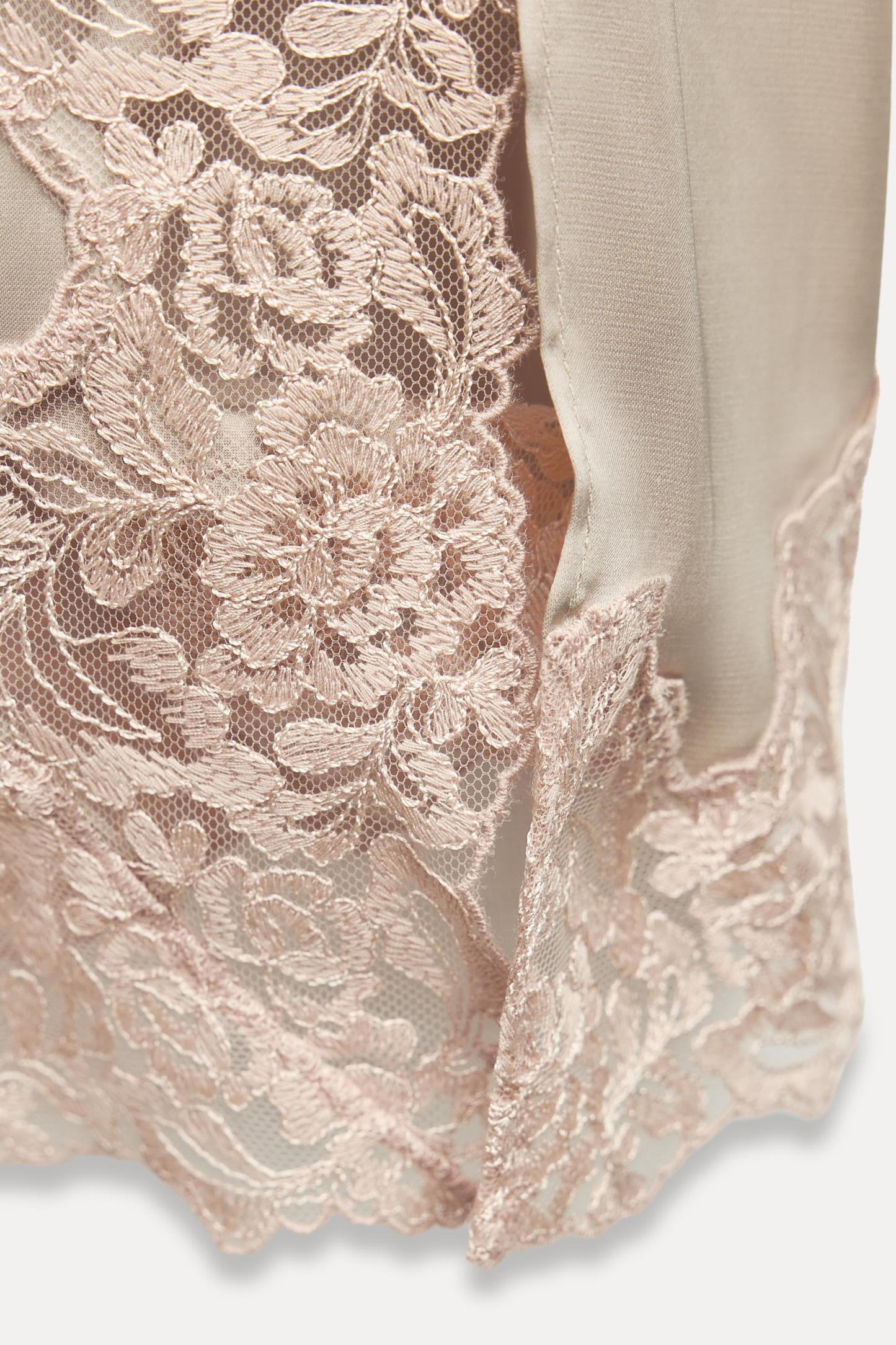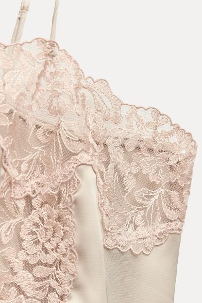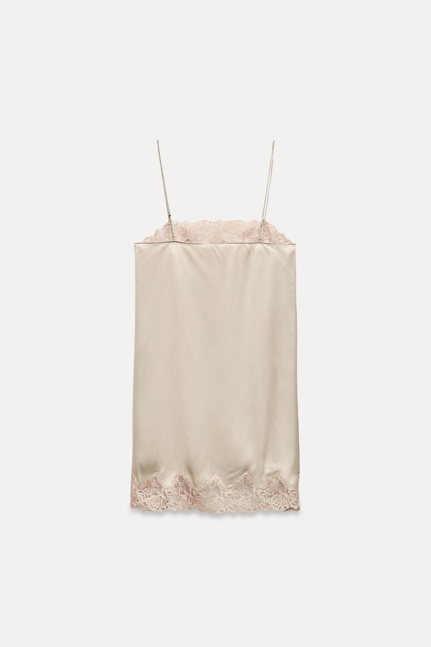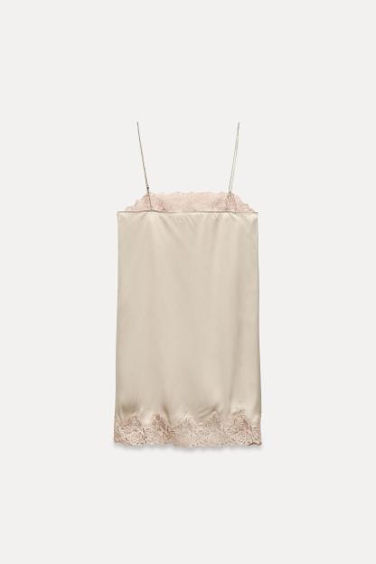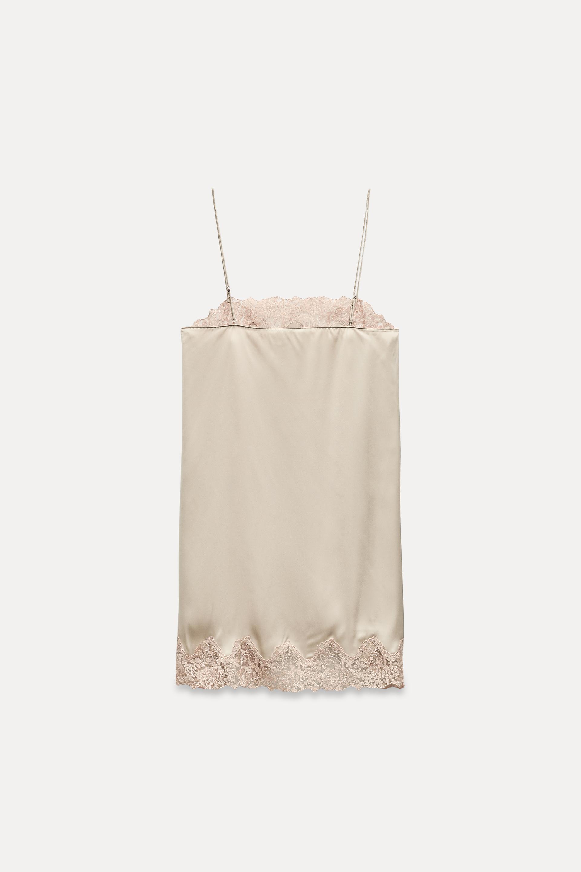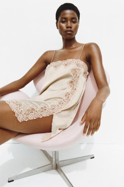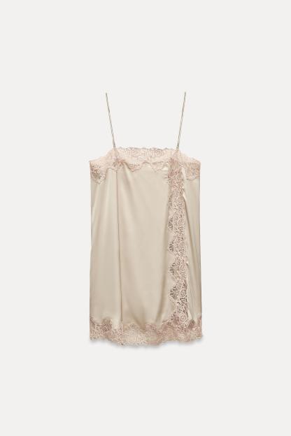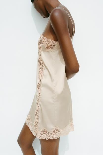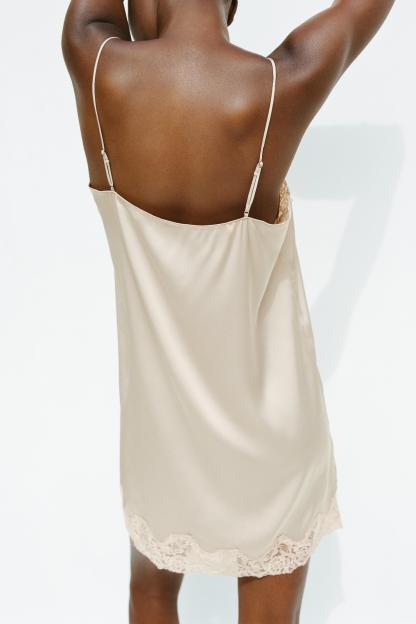 Short dress with straight neckline and adjustable spaghetti straps. Contrast lace appliqué. Side slit at hem.
