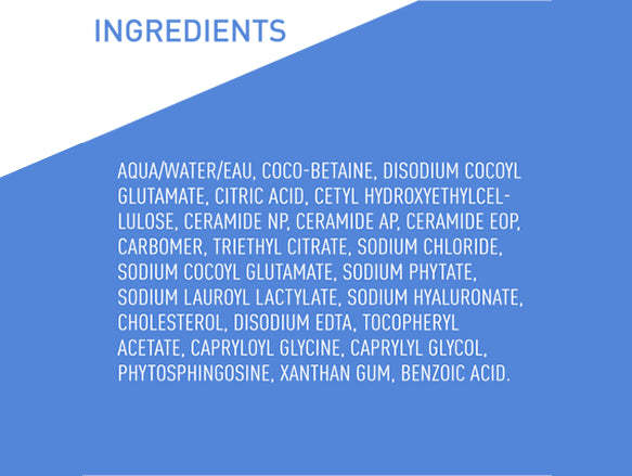 Aqua/Water/Eau, Coco-Betaine, Disodium Cocoyl Glutamate, Citric Acid, Cetyl Hydroxyethylcellulose, Ceramide NP, Ceramide AP, Ceramide EOP, Carbomer, Triethyl Citrate, Sodium Chloride, Sodium Cocoyl Glutamate, Sodium Phytate, Sodium Lauroyl Lactylate,