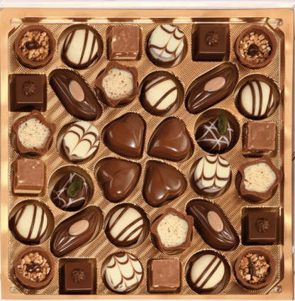 Sugar, cocoa butter, whole MILK powder, cocoa mass, hazelnuts, almonds, pure butterfat, skimmed MILK powder, glucose syrup, dextrose, MILK sugar, lemon peel, orange peel, invert sugar syrup, Marc de Champagne, PISTAZIA, glucose fructose syrup, emulsifier (SOYA and sunflower lecithin), whole MILK, SAHNE powder, alcohol, WHEAT flour, cherry brandy, coffee, natural flavors, barley malt extract, flavors, humectant (invertase), SAHNE, salt, low-fat cocoa powder, lemon juice concentrate, natural orange flavor, coconut fat, acidifier (citric acid), glazing agent (gum arabic), caramel sugar syrup. May contain other SHELL FRUITS.