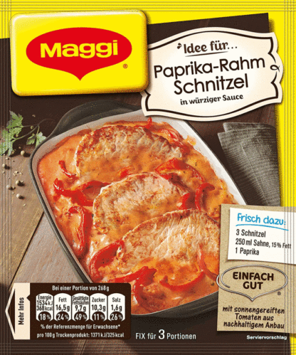 Schnitzel fans watch out! Fix f��r Paprika-Rahm Schnitzel can be ideally integrated into everyday cooking and refined with fresh ingredients to create a hearty cream schnitzel. A creamy-spicy paprika-cream sauce, which can be prepared in no time with the MAGGI Fix, ensures a very special treat.